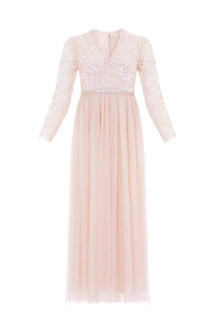 NEEDLE & THREAD EXCLUSIVE. The Amalie Bodice Long Sleeve V-Neck Ankle Gown in Petal Pink. Featuring a bodice decorated with intricate shimmering sequins and floral motifs, this long-sleeved, V-neck gown is designed with a layered tulle skirt featuring ‘x’ motifs throughout, adding subtle texture. Make this gown your new season go-to.