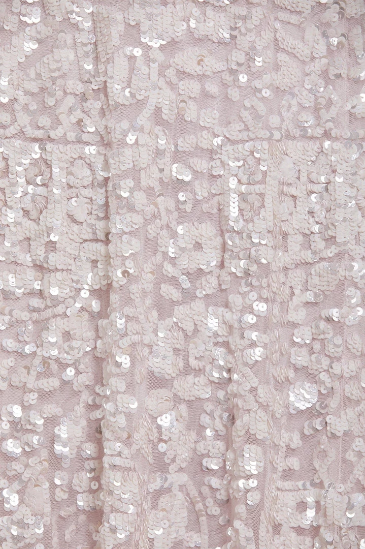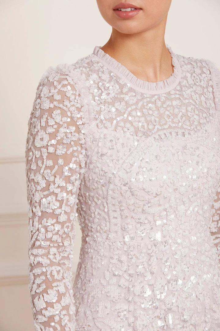 NEW SEASON. The Amaryllis Gown in Powder Pink/White. This embellished gown has a fluid floral artwork design with shimmering white sequins. Beautifully crafted with tulle details and a voluminous skirt to create added movement as you walk. Make a statement in the Amaryllis at your next event.