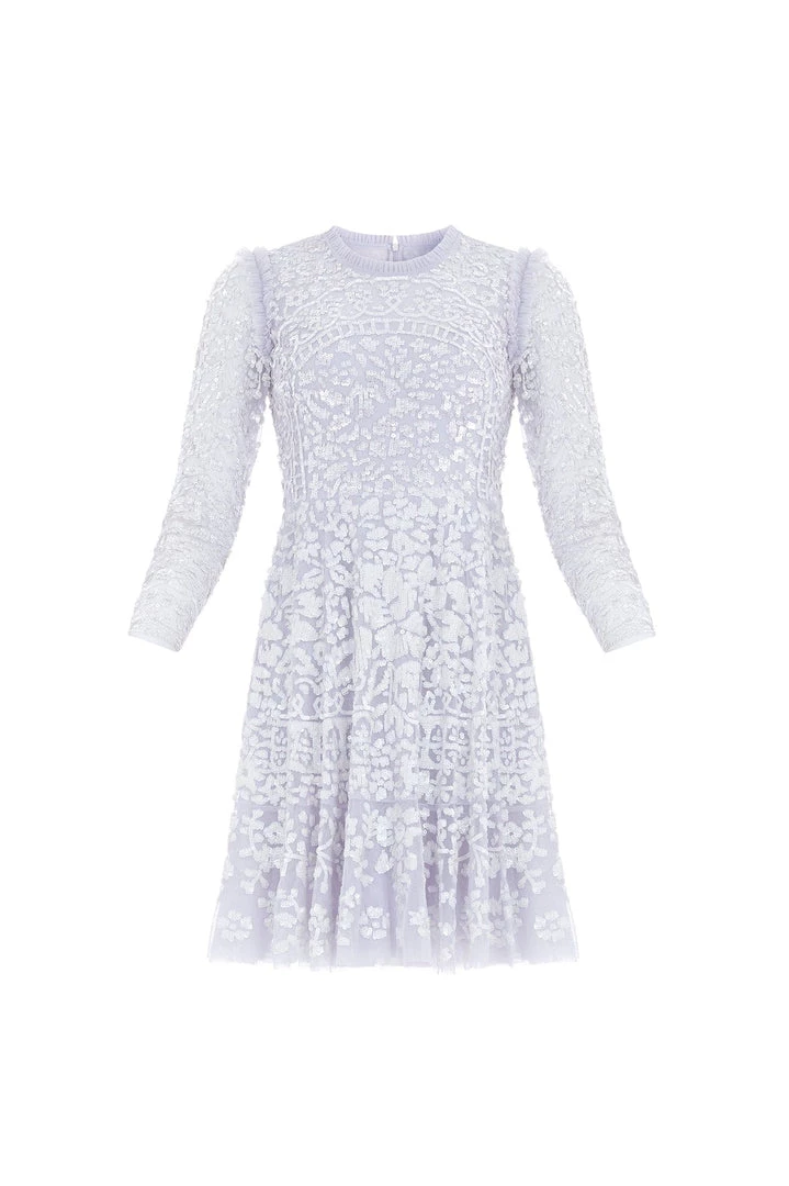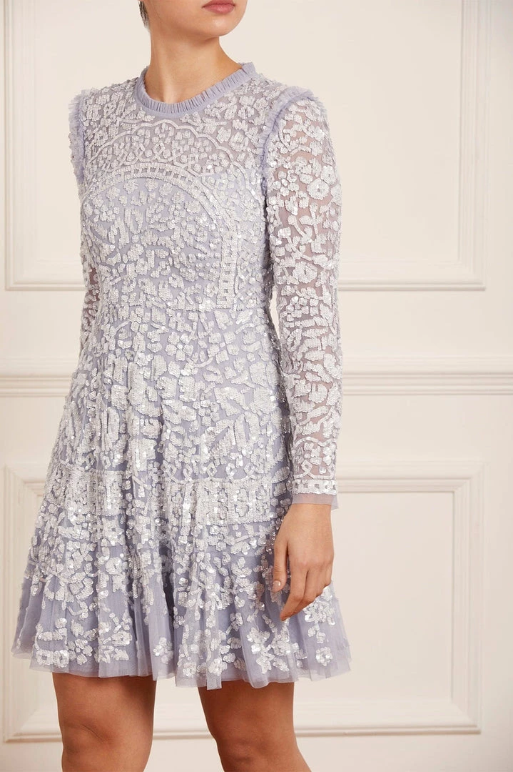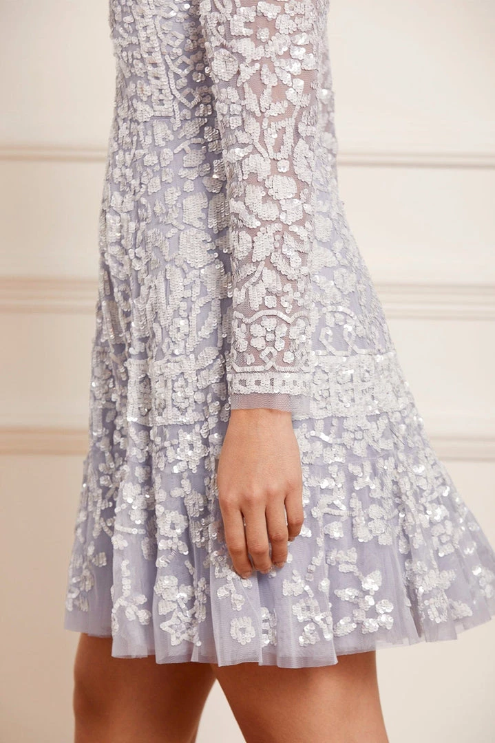 NEW SEASON. The Amaryllis Mini Dress in Porcelain Blue/White. This embellished mini dress has a fluid floral artwork design with shimmering white sequins. Beautifully crafted with tulle details and a voluminous skirt to create added movement as you walk. Make a statement in the Amaryllis at your next event.