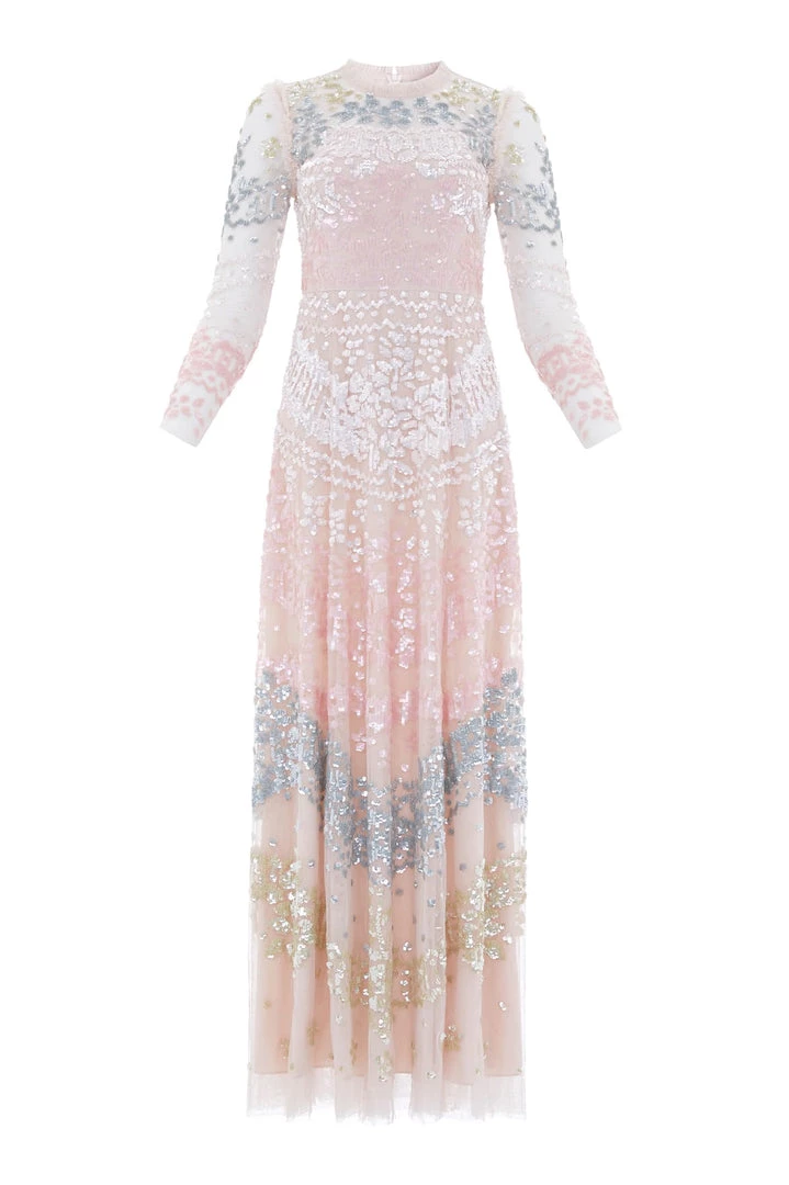 The Angeline Sequin Gown in Pearl Rose / Multi. This eye-catching gown is decorated with muted rainbow shimmering sequins in green, blue and pink. Inspired by a vintage floral lace artwork with horizontal highlights. The Angeline has long sleeves with pretty floral elements, engineered to flatter the A-line silhouette. There is delicate frill lace detailing around the neck and arm for further intrigue. Make an entrance in this showstopping dress.