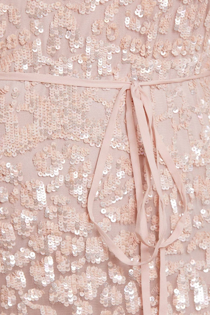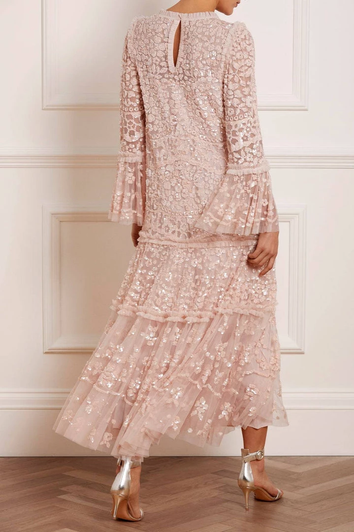 The Annie Sequin Tiered Ankle Gown in Petal Pink. Adorned with shimmering sequins in a floral and bow artwork, this gown is inspired by a lace tablecloth. Designed with a loose fit silhouette and tiered throughout, creating beautiful movement. Make an effortless statement.