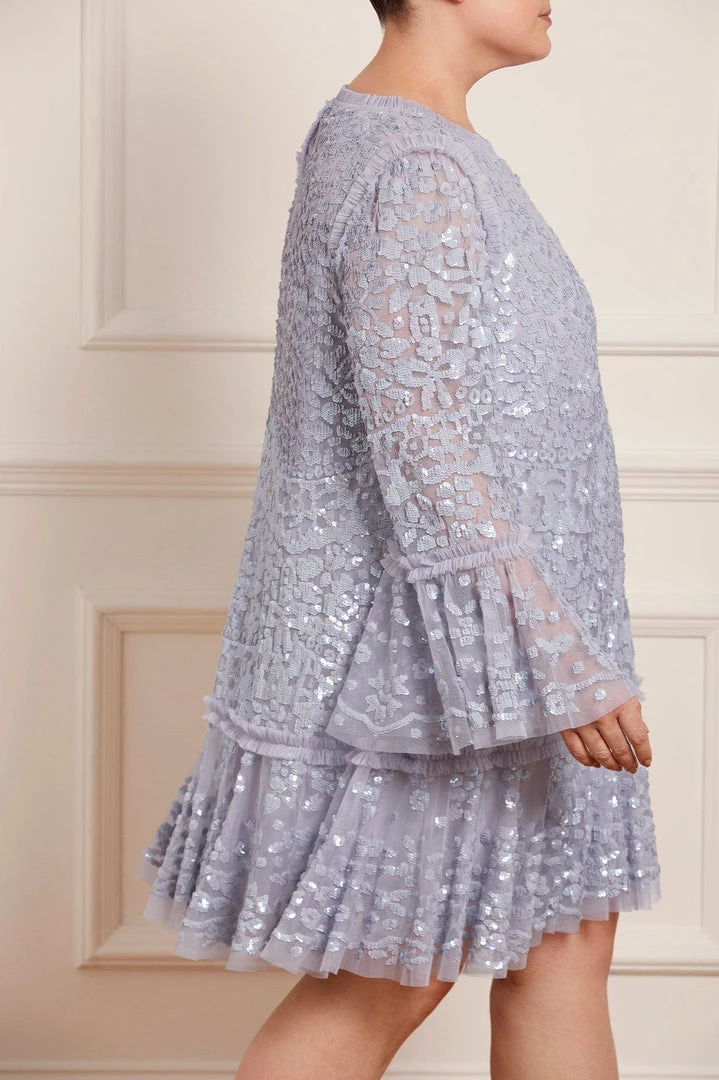 NEW SEASON. The Annie Sequin Tiered Mini Dress in Porcelain Blue. Inspired by a vintage lace tablecloth, this dress is adorned with tonal shimmering sequins in a floral and bow artwork. Designed with a relaxed fitting silhouette and tiered throughout, creating beautiful movement. The Annie mini can be worn with or without the waist tie to accentuate the figure. Make an effortless statement in this stunning dress.