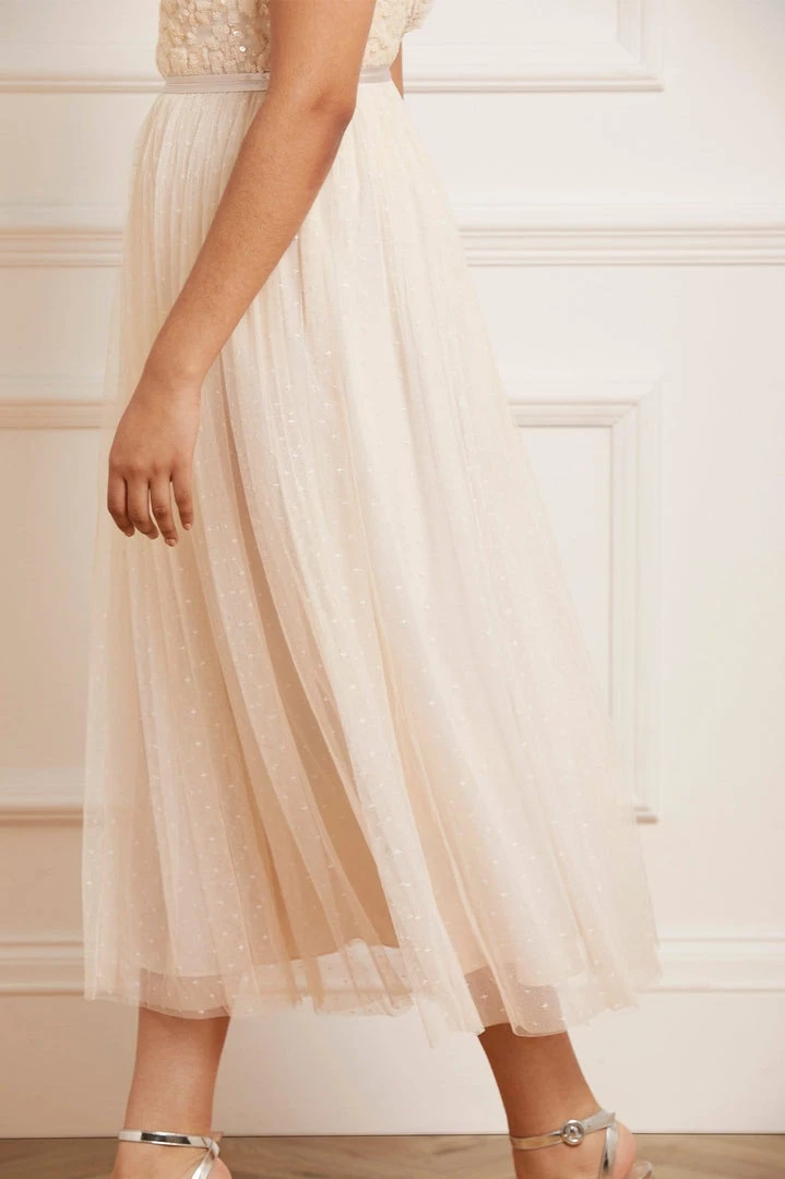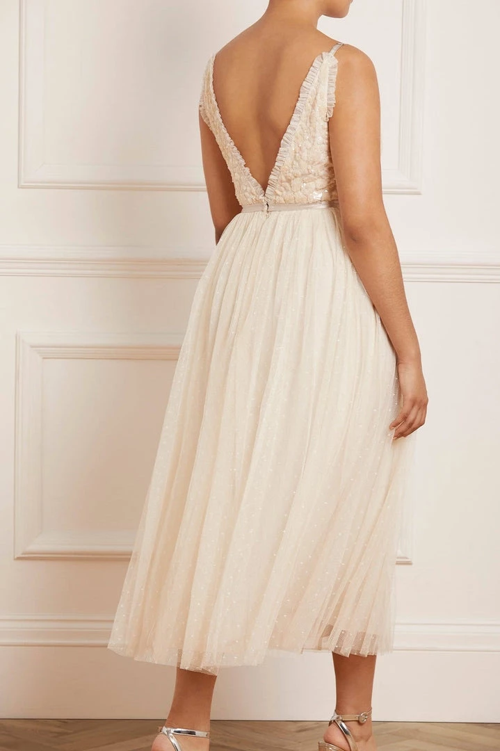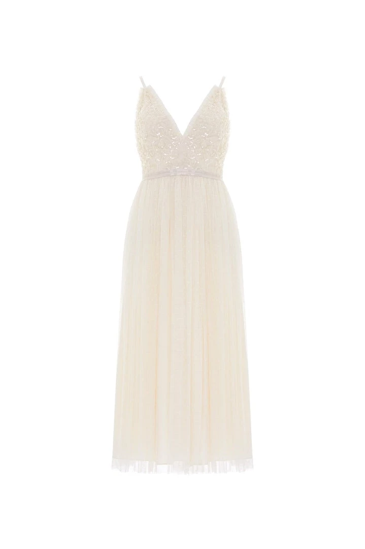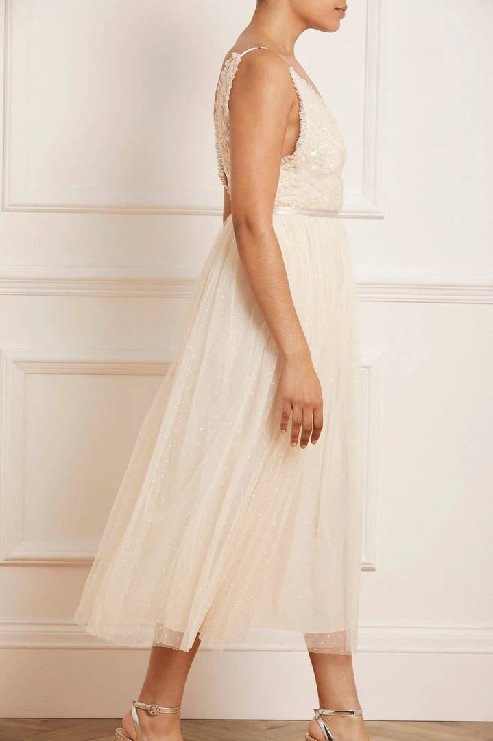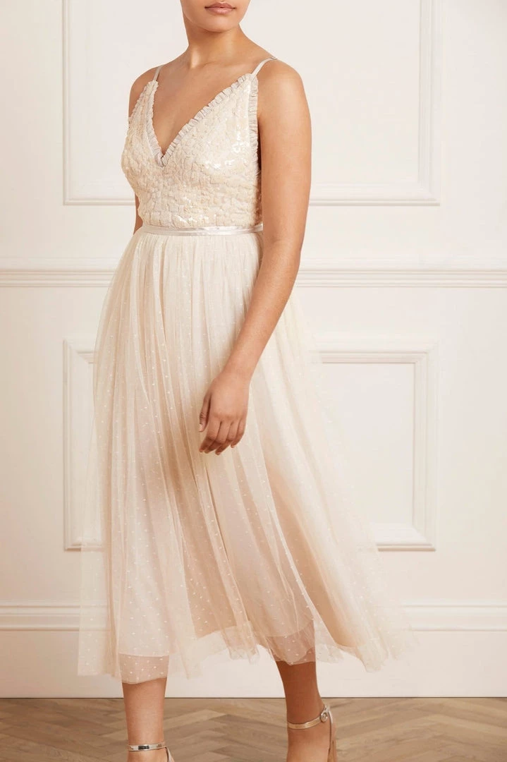 The Aurelia Bodice Cami Ballerina Dress in Champagne. This Needle & Thread signature style is beautifully designed with floral lace artwork inspired by a vintage tablecloth. Adorned with shimmering sequins on the bodice gently flowing into a soft tulle skirt. Make an entrance in the Aurelia.