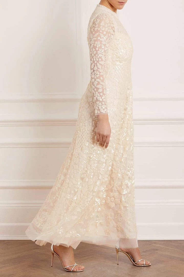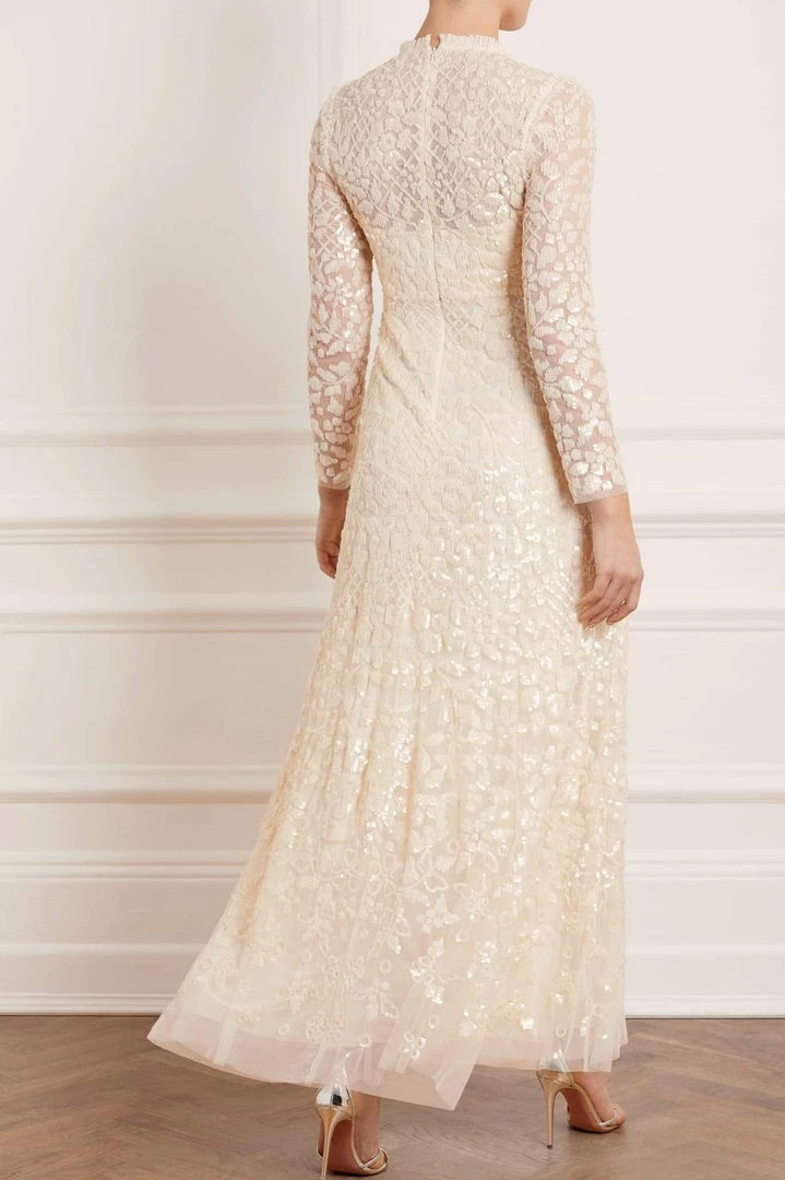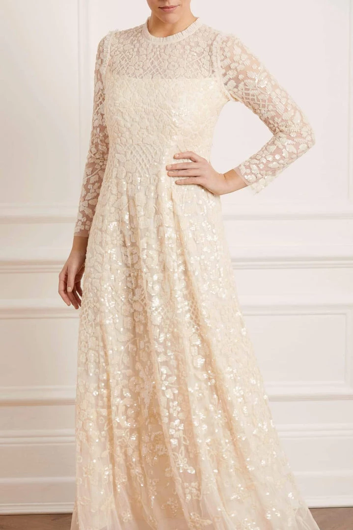 The Aurelia Long Sleeve Gown in Champagne. Beautifully designed with floral lace artwork, inspired by a vintage lace tablecloth. This ballerina-length dress is decorated with shimmering sequins in pretty, soft tones. Romantically developed with long sleeves and playful, feminine detailing. Ensure all eyes are on you in the Aurelia.