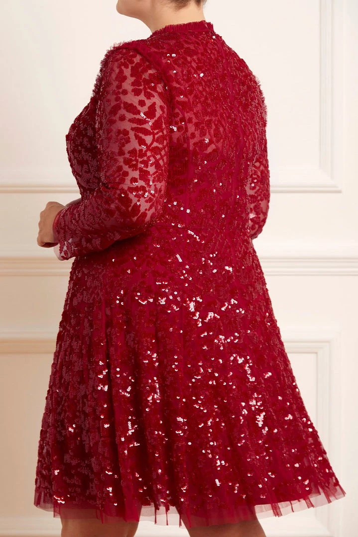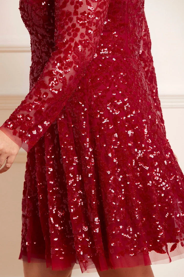 NEEDLE & THREAD EXCLUSIVE. The Aurelia Long Sleeve Mini Dress in Deep Red. This Needle & Thread signature style is beautifully designed with floral lace artwork inspired by a vintage tablecloth. Adorned with shimmering sequins and soft tulle frills in romantic, deep red. Perfect for making an entrance.