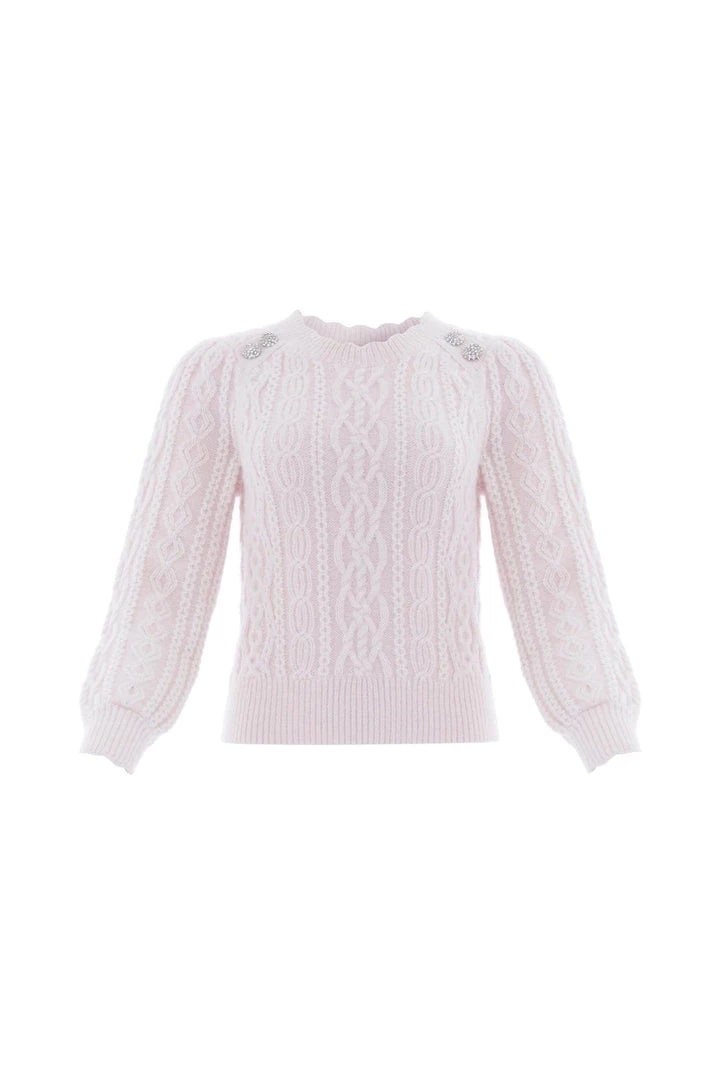NEEDLE & THREAD EXCLUSIVE. The Cable Jewelled Button Midline Jumper in Light Pink / Champagne. This sweater is crafted from soft alpaca yarn, resulting in a cosy, fluffy texture. Decorated beautifully with intricate cable stitches contrasted in pink and champagne tones. Designed with a slim fit, crystal buttons and scallop detailing. A new Needle & Thread favourite.