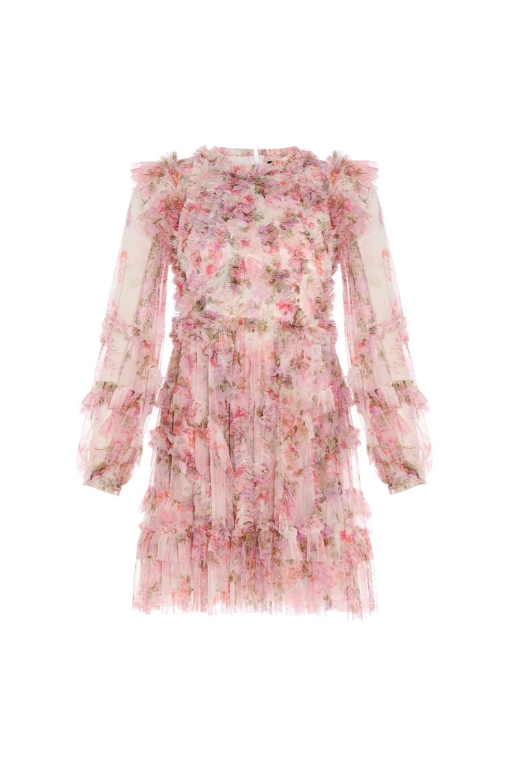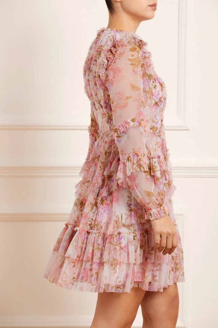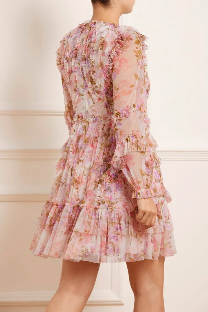 The Darling Meadow Ruffle Mini Dress in Pink / Multi. A brand new style for the season ahead. This mini dress is beautifully printed with painted flowers and garden motifs, inspired by a vintage French fabric. Crafted with ruffles to create a flattering shape and a romantic texture. A truly timeless piece.