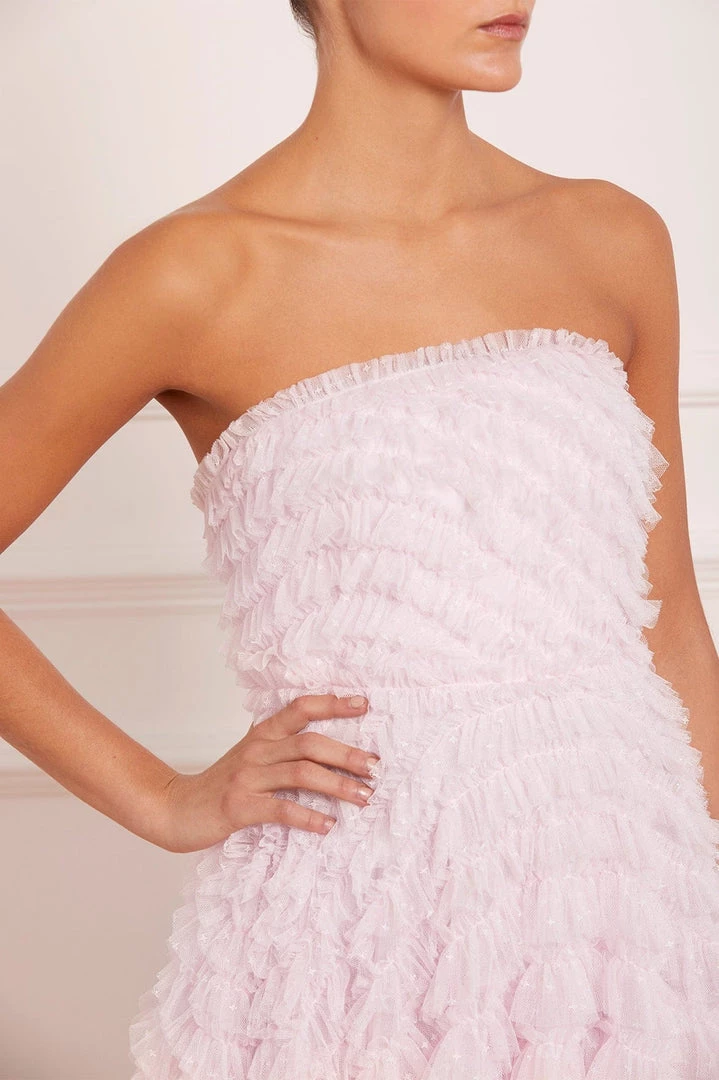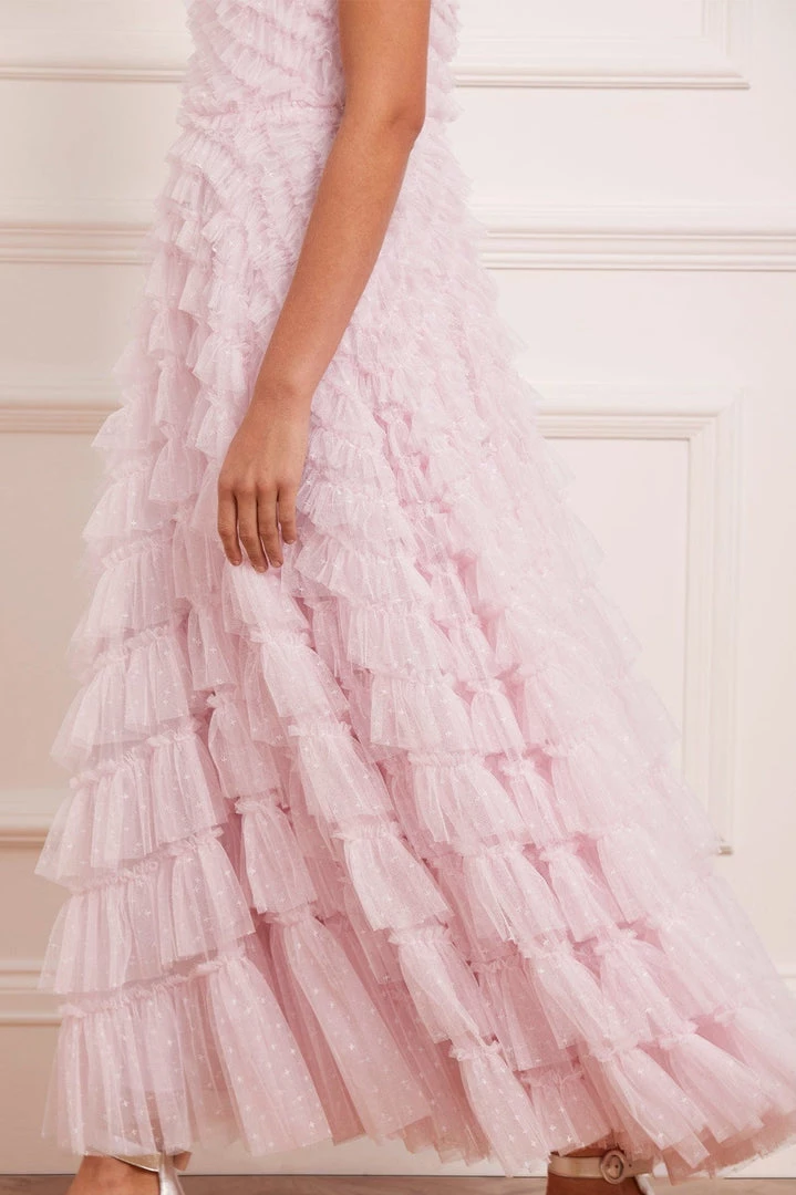 NEW SEASON | NEEDLE & THREAD EXCLUSIVE. The Elizabeth Rose Corset Ankle Gown in Wisteria. This corset gown is a classic, romantic style. Beautifully designed with large frills and layered tulle throughout the silhouette, adding volume and creating whimsical movement. The corset bodice features internal panels of power mesh fabric, adding structure to hold the silhouette in place whilst still allowing movement and comfort. Make a statement in the Elizabeth Rose.