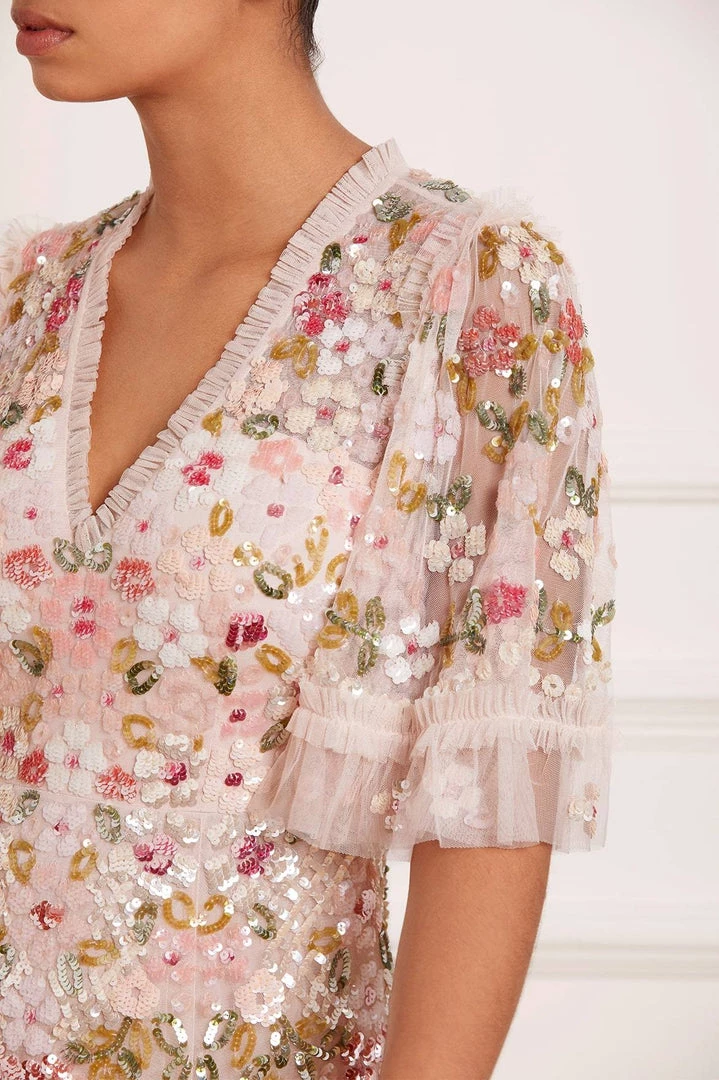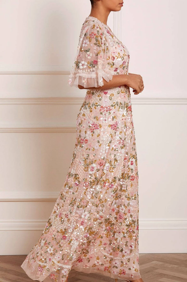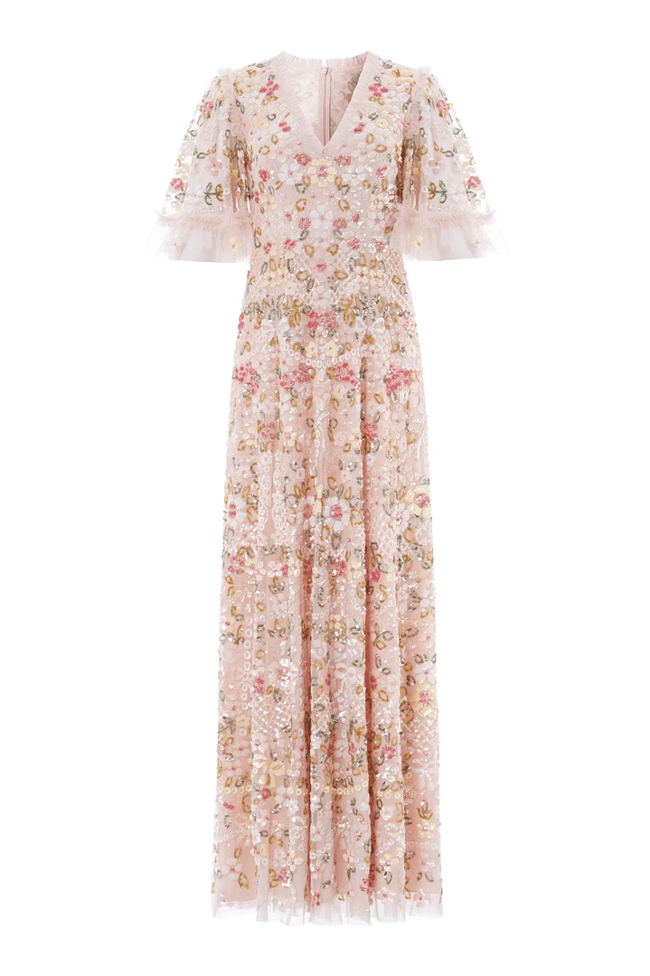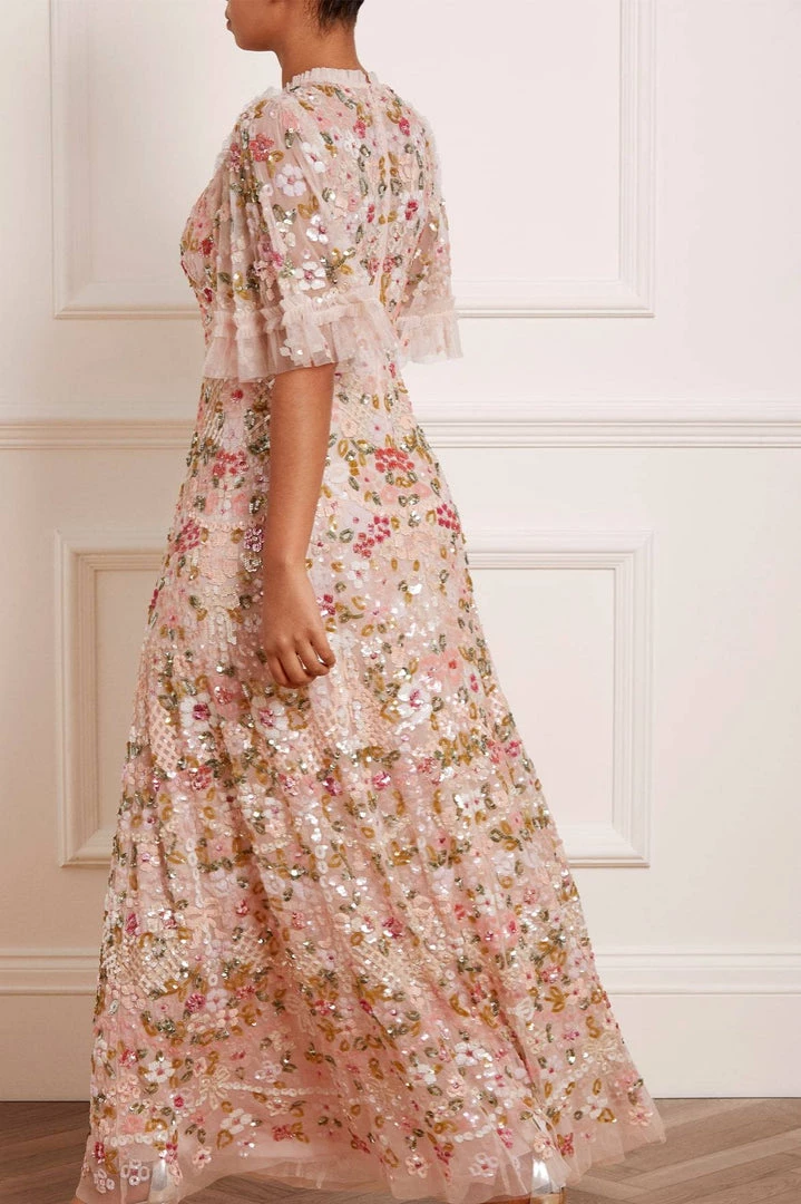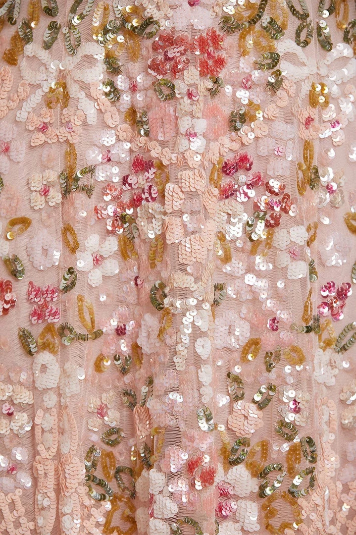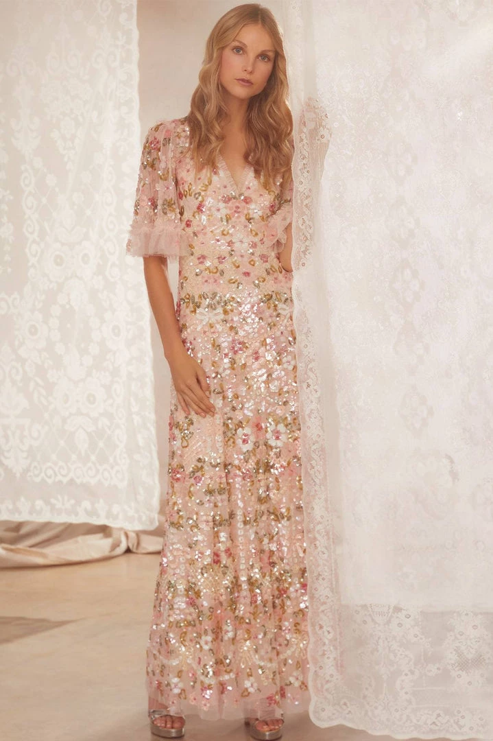 The Enchanted Meadow Sequin V-Neck Gown in Petal Pink. This enchanting gown is beautifully embellished with ornate artwork featuring floral and lace motifs. Designed with multi-coloured sequins scattered throughout, intricate frills at the bottom and a V-neck. Perfect for effortless wow factor.