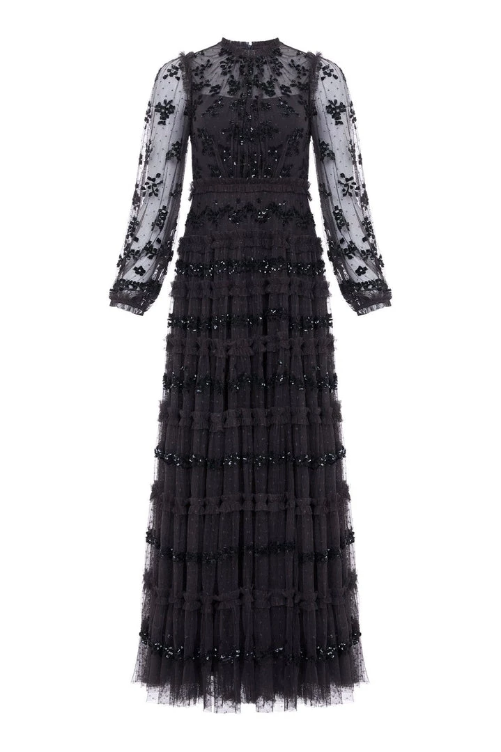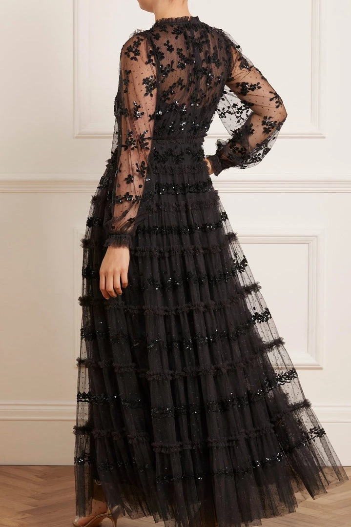 The Eve Sequin Gown in Graphite. This gown is romantically designed with a flattering, gently gathered bodice and full sleeves. Crafted with layers of our signature kisses tulle, and intricately adorned with shimmering sequin borders in pretty, lace-inspired designs. Make a statement in the Eve this season.