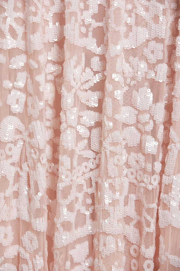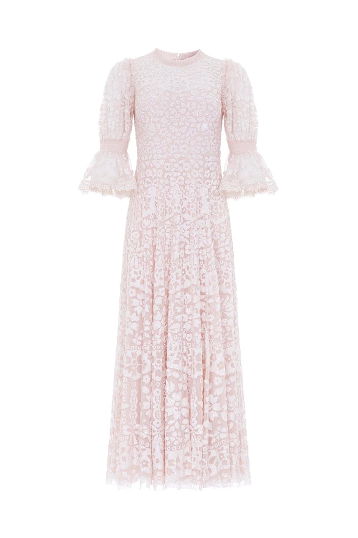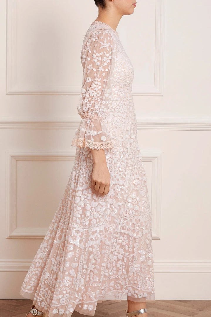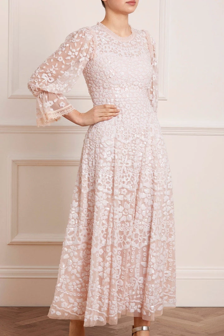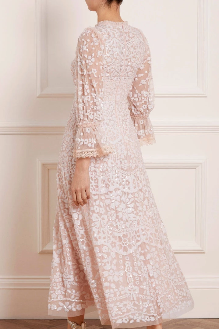 The FilIgree Lace Sequin Ankle Gown in Petal Pink / White. This statement piece is heavily embellished with shimmering sequins, inspired by a pretty lace tablecloth artwork. Designed with Victoriana inspired sleeves, dramatic cuff detailing and intricate lace trims. A truly special piece in the collection.