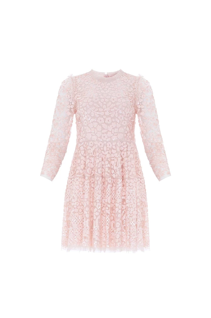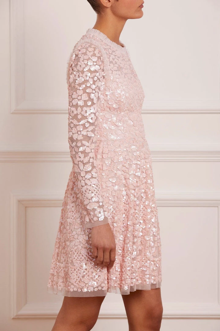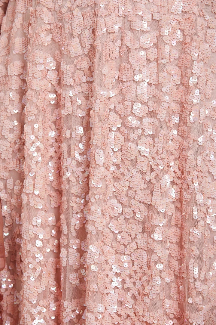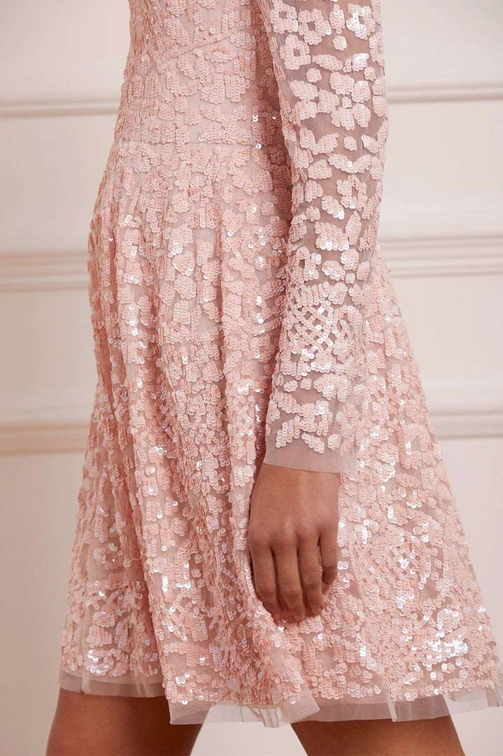 The Floral Daze Sequin Micro Mini in Petal Pink / Coral. A beautiful new silhouette for the season ahead. This mini dress is densely decorated with shimmering sequins inspired by a pretty floral lace tablecloth. Exquisitely designed with a layered, soft net to hold this flattering shape. A truly special piece.