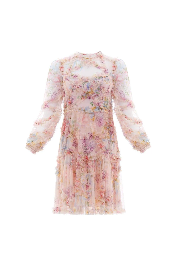 Floral Diamond Ruffle Dress in Topaz Pink. This eye-catching piece is crafted from delicate ruffled tulle with an all-over vintage print taken from an early 1900’s hand-painted fabric design. A romantic look featuring voluminous cuffed sleeves and a flattering skirt that skims the body to gently increase in fullness, creating stunning movement within the tulle. This Victorian-inspired look with a contemporary edge will be the star of your wardrobe.