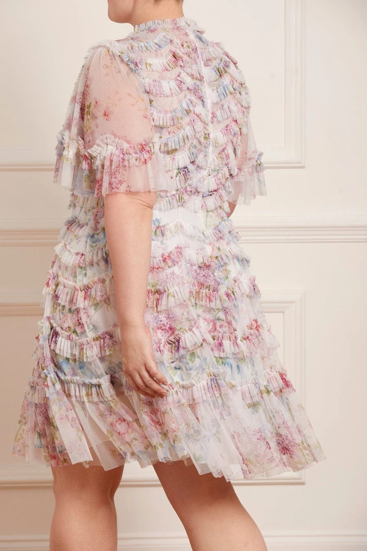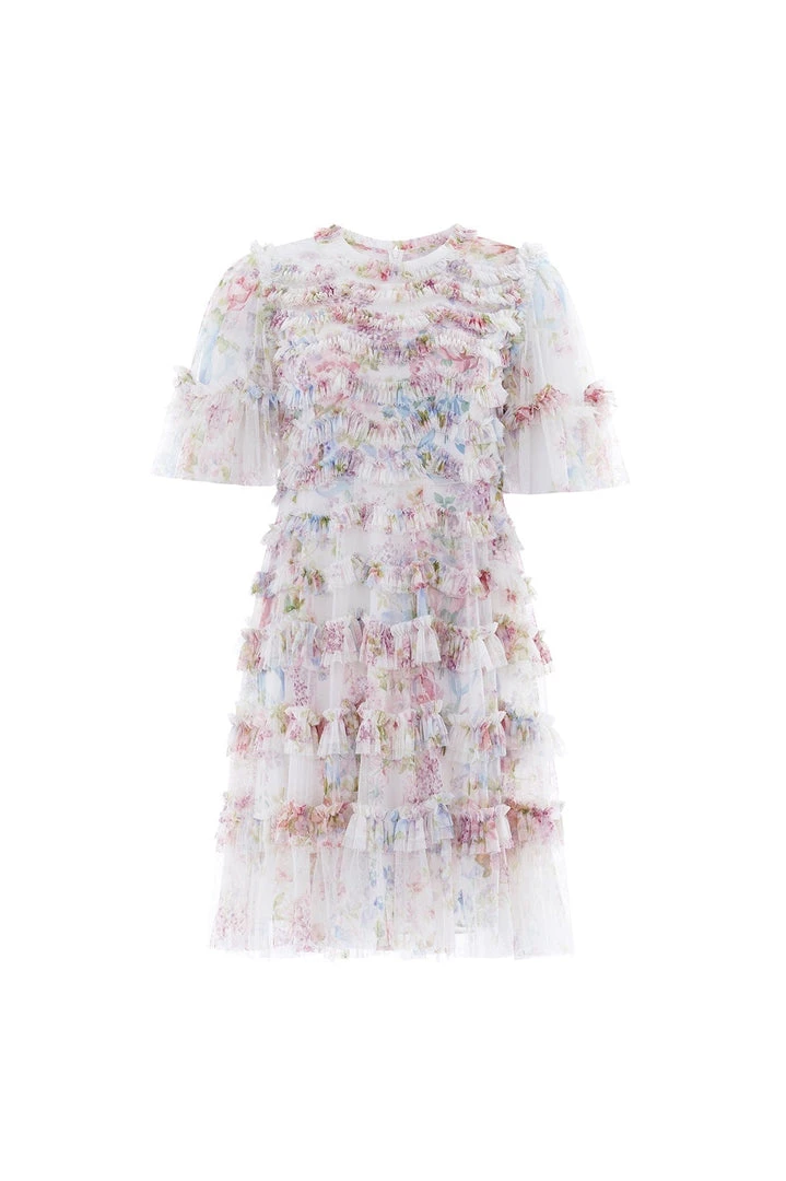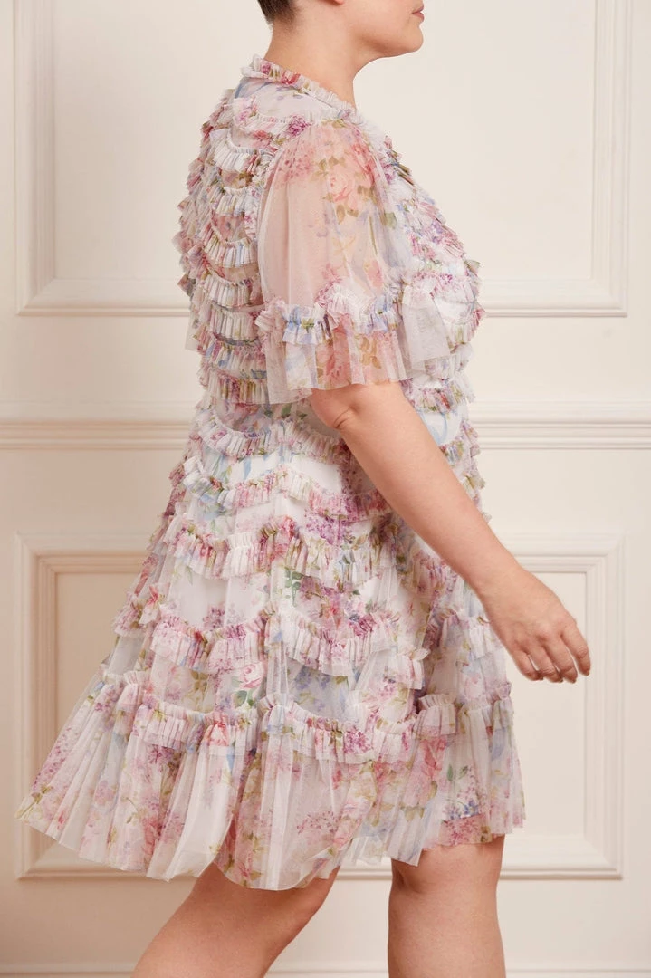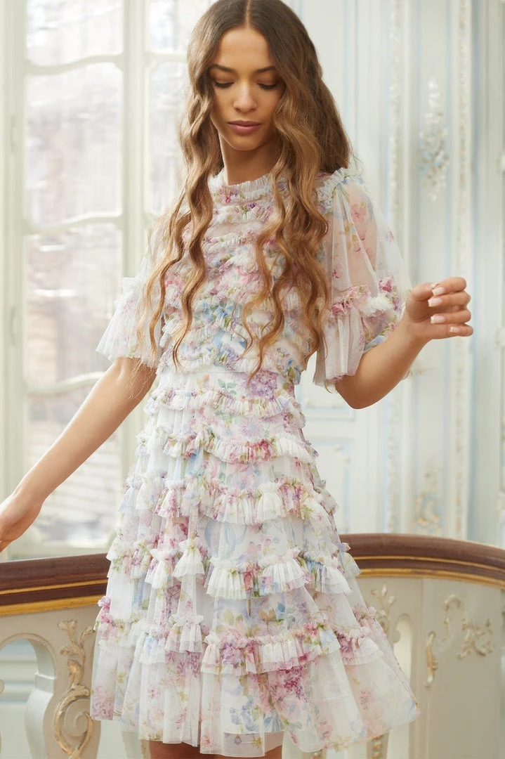NEW SEASON. The Floral Wonder Ruffle Mini Dress in Moonshine. This mini dress features a floral bouquet print taken from a 1900’s hand painted artwork. Beautifully designed using tulle scallop detailing, creating pretty textured frills. This statement style has floaty sleeves and a flattering silhouette, creating a romantic look. The perfect mini dress for every occasion.
