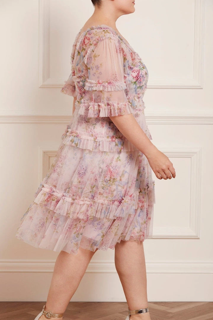 NEW SEASON. The Floral Wonder V-Neck Midi Dress in Powder Pink. This midi dress features a pretty floral bouquet print taken from a 1900’s hand painted artwork. This dress is adorned with subtle, signature tulle ruffles and has a flattering silhouette. Crafted with a tulle frill tier skirt adding romantic texture. A truly elegant piece for your upcoming events.