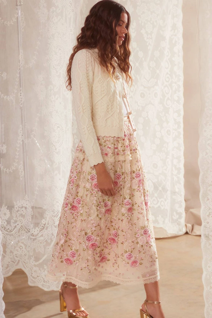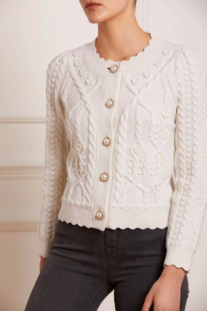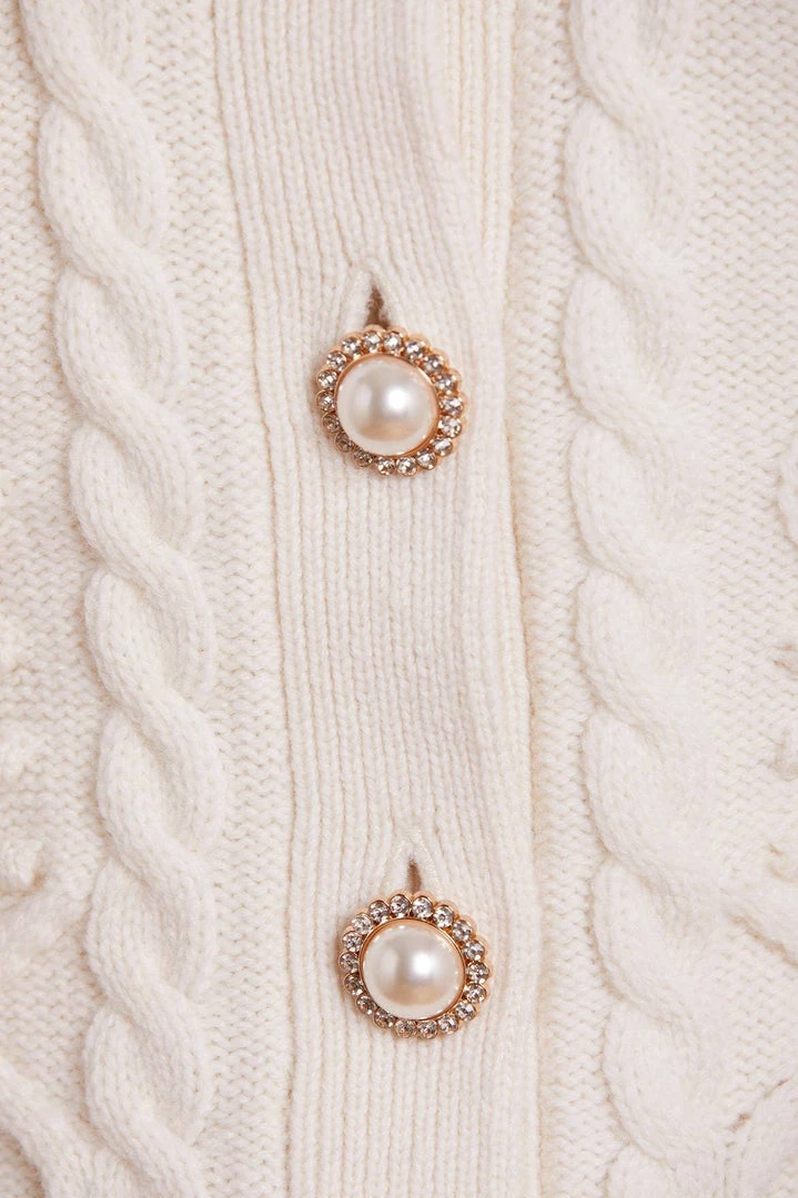 NEEDLE & THREAD EXCLUSIVE. The Flower Applique Short Cardigan in Cream. Made from soft wool, this cardigan is beautifully decorated with faux pearl and crystal-embellished buttons. Designed with pretty crochet flowers, intricate trailing cables and bobbles, creating feminine detail throughout. The knit you will be forever thankful for.