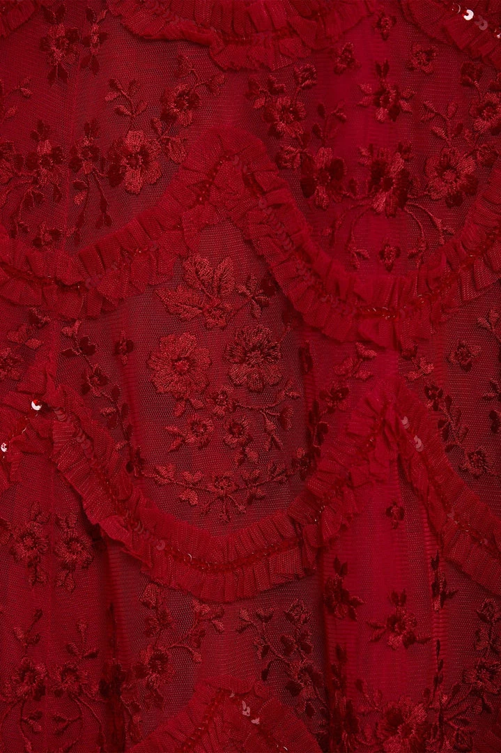 NEW SEASON. The Lily Bloom Ankle Gown in Deep Red. This ankle gown is beautifully designed with delicate tulle ruffles and soft scallop shaping for signature Needle & Thread styling. Adorned with intricate white floral embroidery and trimmed with a high shine sequin adding shimmer throughout. Make the Lily your new wardrobe addition.