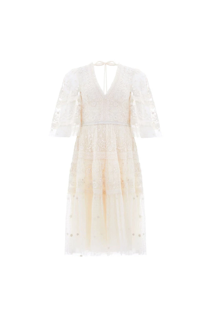 The Lottie Lace Midi Dress in Champagne. A signature Needle & Thread style, updated for the new season ahead. Taking inspiration from Victorian lace, the Lottie features intricately embroidered artwork in a romantic red on delicate tulle. Lace trims border the neckline and frame each tier of the skirt. This embroidered lace dress has sheer, romantic sleeves and our signature grosgrain ribbon at the waist. The perfect dress to take you from day to night.