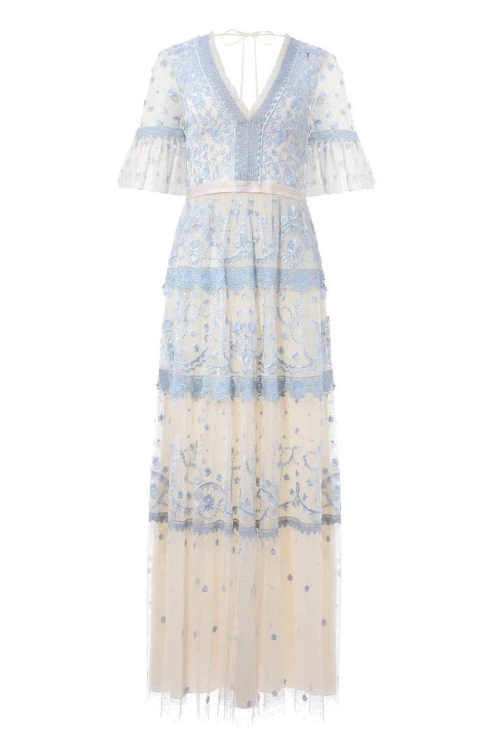 NEEDLE & THREAD EXCLUSIVE | The Midsummer Lace Gown in Champagne/Blue. Artwork inspired by Victorian floral lace. Beautifully designed with scattered floral motifs and intricate scallop border designs, depicted in tonal embroidery threads onto delicate kisses tulle. Featuring intricately cut floral lace trims that border the neckline and frame each tier of the skirt. This embroidered lace gown has sheer romantic sleeves and our signature grosgrain ribbon at the waist. The perfect gown to take you from day-to-night.