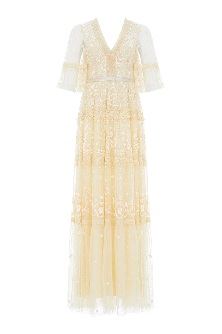 The Midsummer Lace Gown in Buttercup. A signature Needle & Thread style, updated for the Taking inspiration from Victorian lace, the Midsummer features intricately embroidered artwork in tonal colours on delicate tulle. Lace trims border the neckline and frame each tier of the skirt. This embroidered lace dress has sheer, romantic sleeves and our signature grosgrain ribbon at the waist. The perfect gown to take you from day to night.