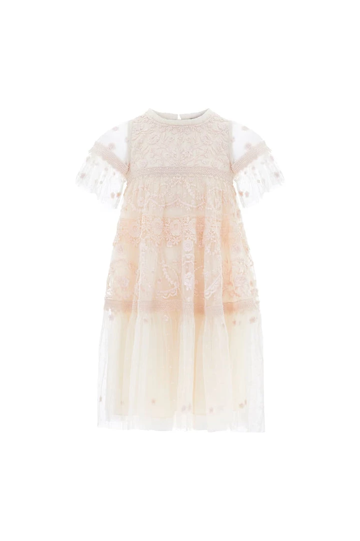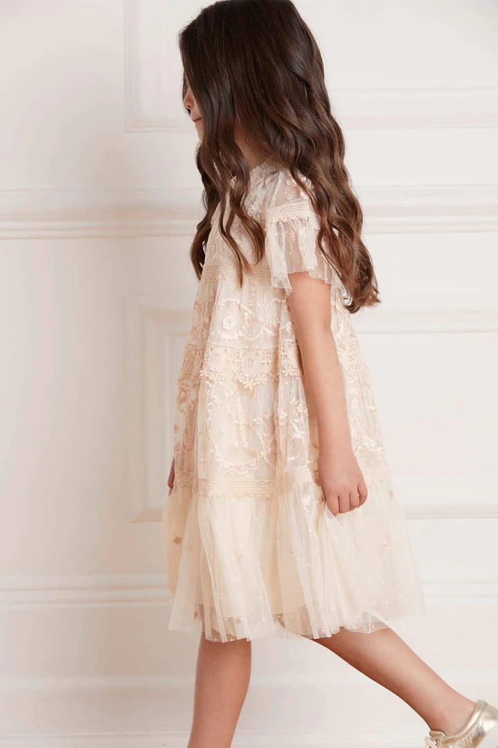 The Midsummer Lace KIDS Dress in Desert Pink / Champagne. This dress is beautifully designed with scattered floral motifs and intricate scallop border designs, depicted in champagne embroidery threads on delicate kisses tulle. This embroidered lace dress has short cap sleeves and a multi-layered tulle skirt with frill detailing throughout. The Midsummer Dress is fit for a princess.