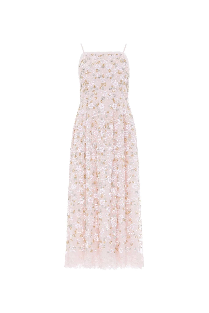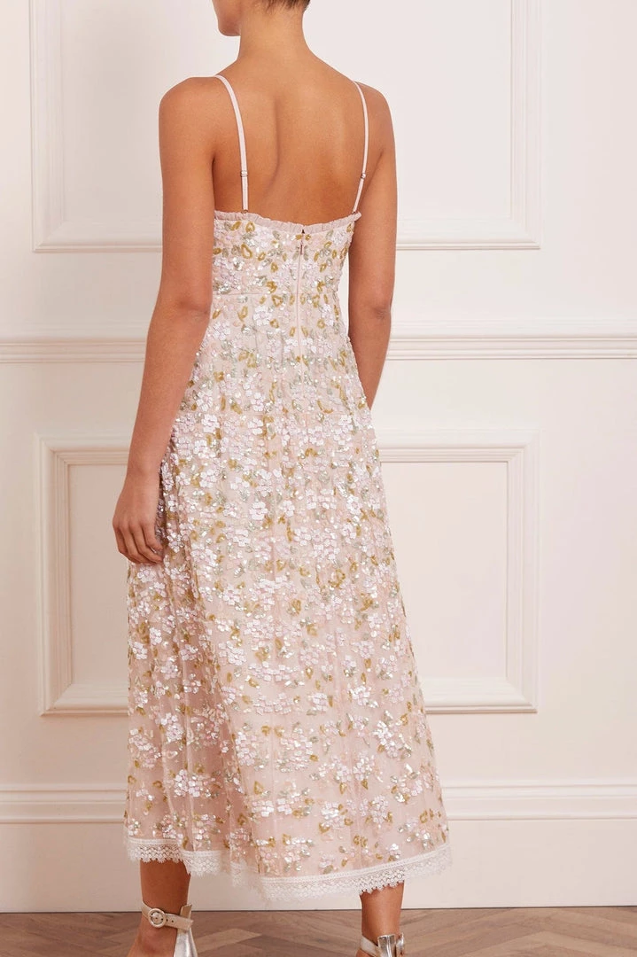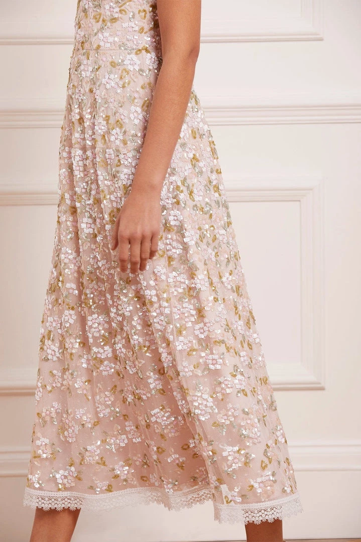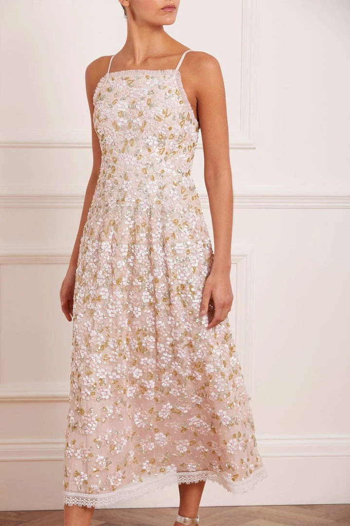 The Pretty Petals Bib Ballerina Dress in Petal Pink / White. This dress features a vintage-inspired neckline taken from pinafore styling in the Secret Garden film. Beautifully adorned with sequined floral motifs throughout and a couture-inspired skirt to create a truly classic piece. The skirt is developed with a net layer to hold this perfectly, flattering shape. Make a statement in the Pretty Petals Ballerina.
