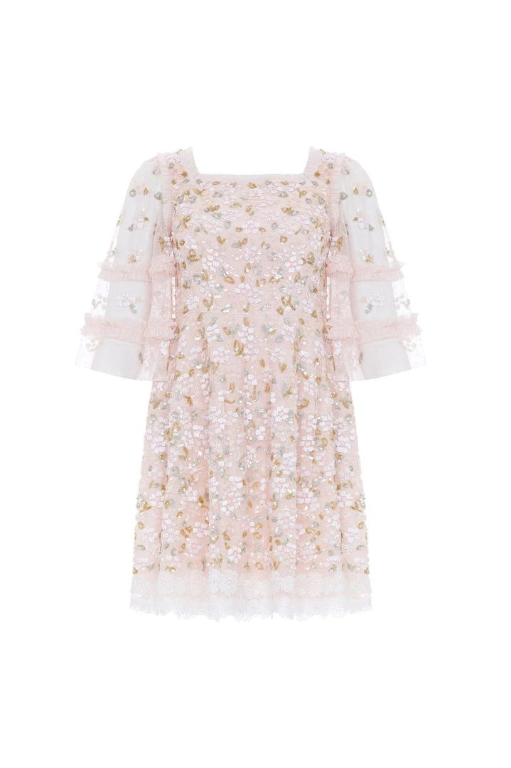 The Pretty Petals Micro Mini Dress in Petal Pink / White. This mini dress is heavily adorned with sequined floral motifs throughout. Designed with a high, square neckline and couture-inspired skirt to create a truly classic piece. The skirt is developed with a net layer to hold this perfectly, flattering shape. Make a statement in the Pretty Petals mini dress.