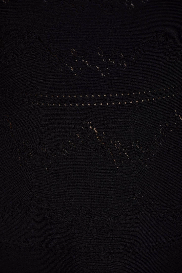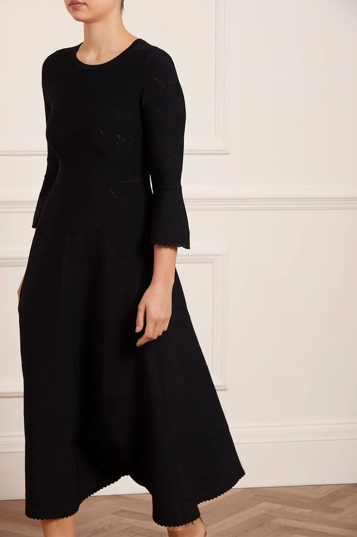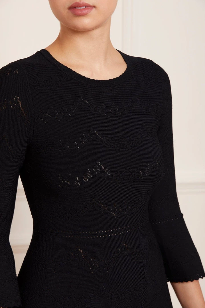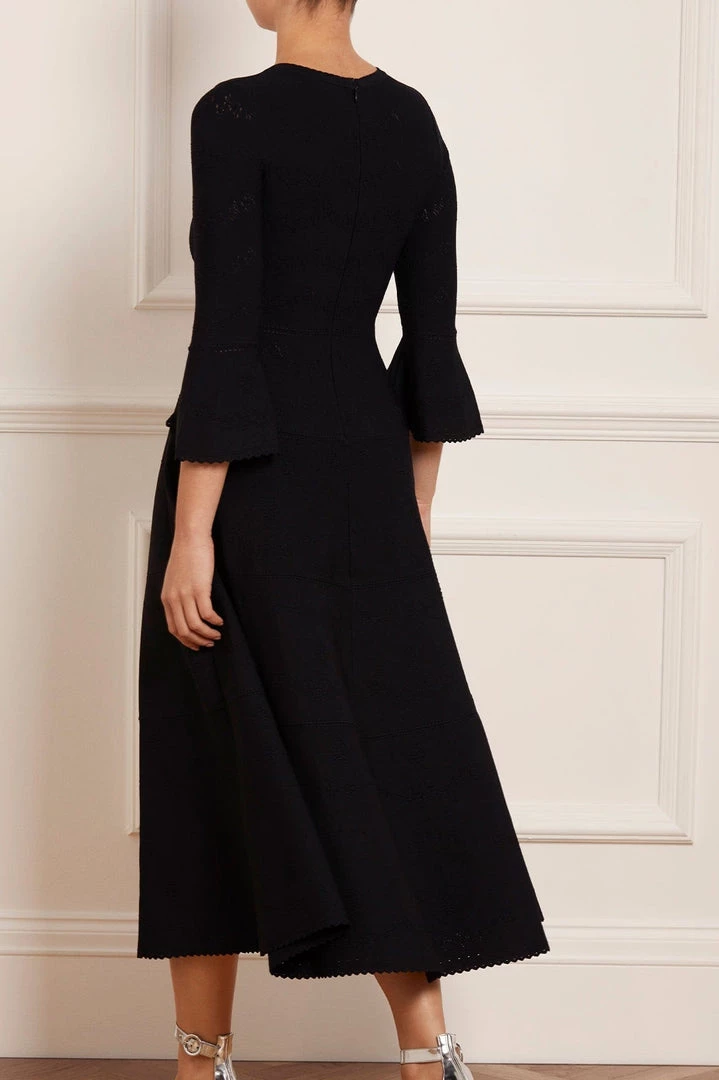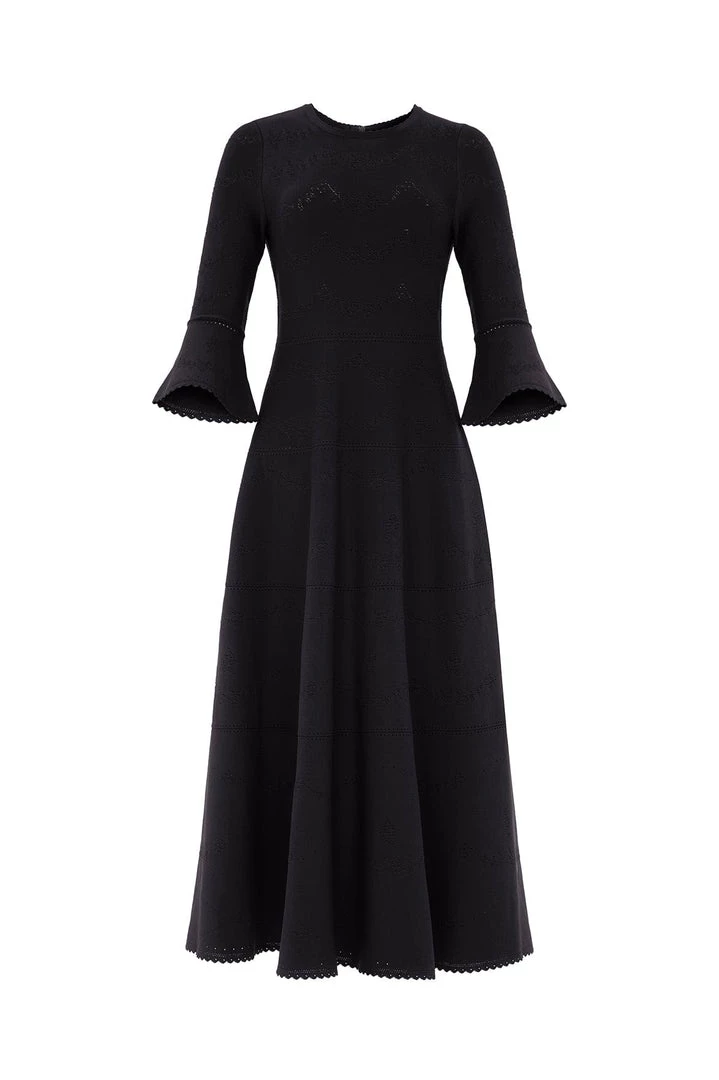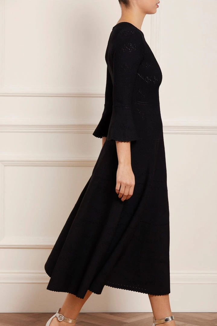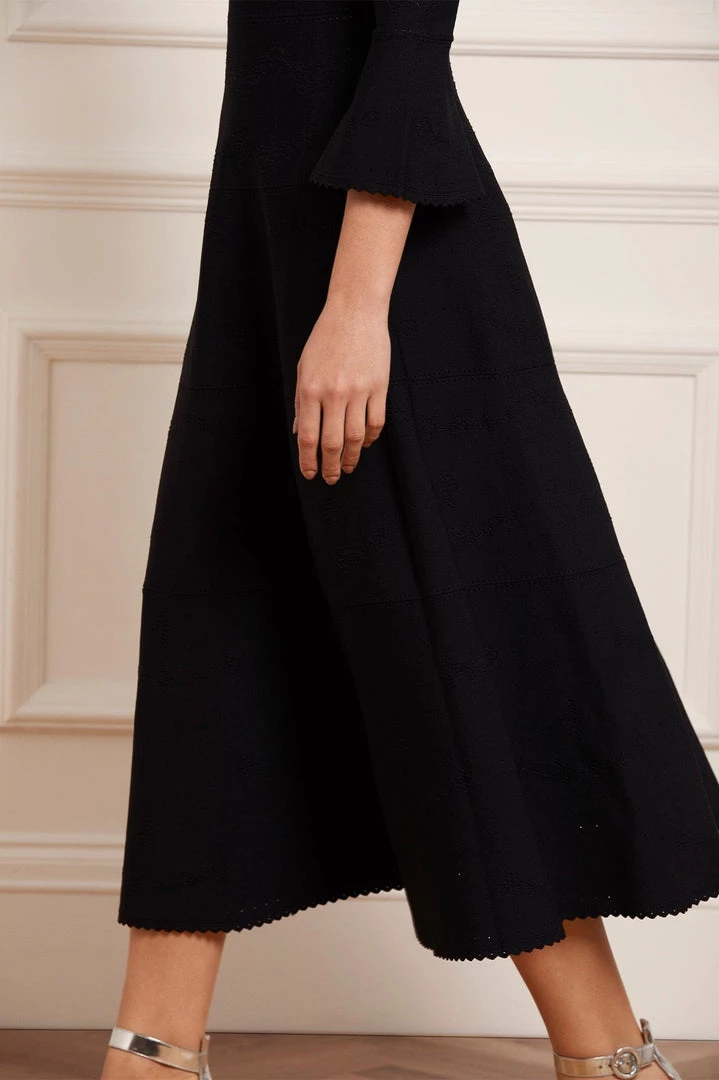 NEW SEASON. The Pretty Pointelle Knit Ankle Gown in Black. A brand new style for Needle & Thread. This knitted gown is inspired by vintage ditsy florals and lace. Beautifully designed with all-over pretty pointelle stitch, delicate florals and scallop details. This gown has a fitted stretch bodice with a soft, round neckline, fluted cuffs and signature Needle & Thread detailing. A truly flattering piece.
