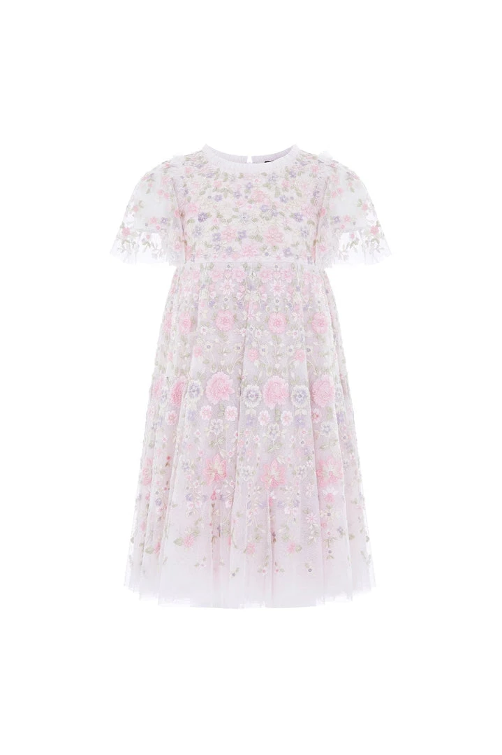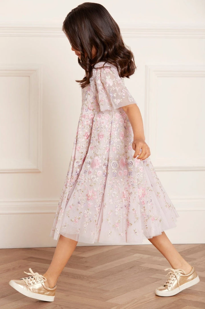 NEW SEASON. The Rose Dream KIDS Prom Dress in Powder Pink/Pink Multi. This dress is intricately embroidered with soft clusters of floral motifs in fresh, romantic pastel tones. Developed on soft, frothy tulle with a whimsical layered skirt, creating playful movement. The perfect dress for those special moments.