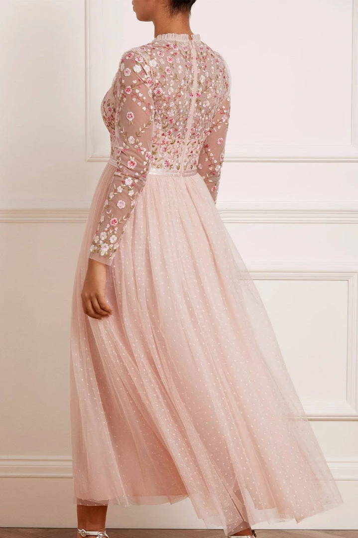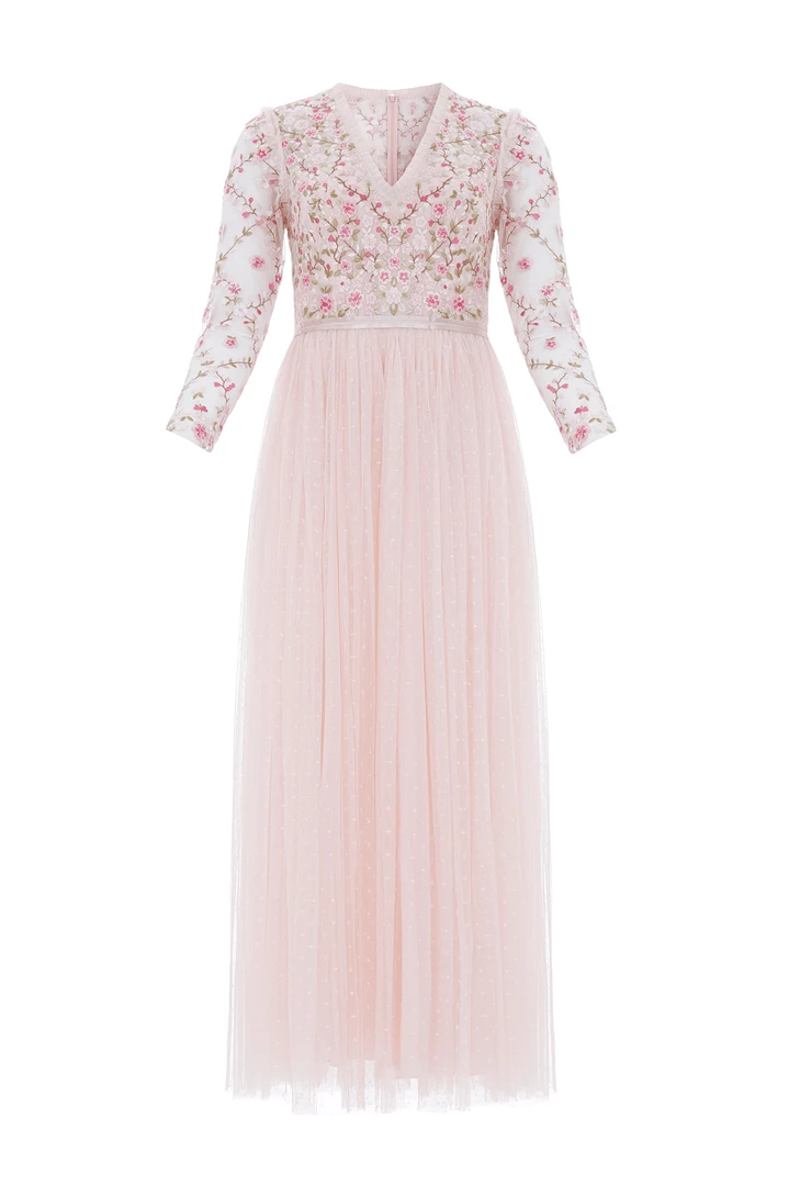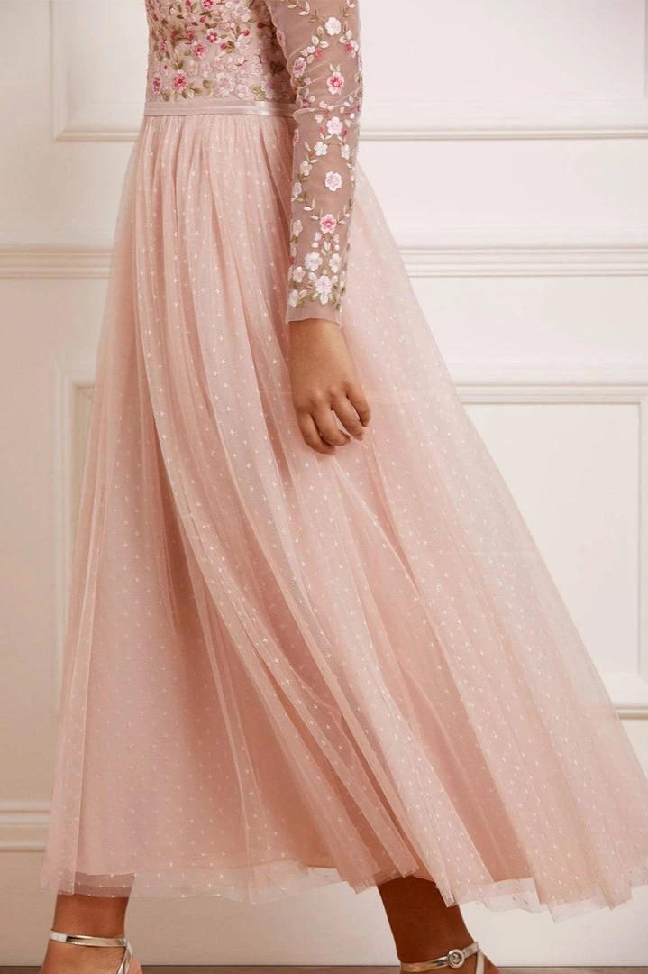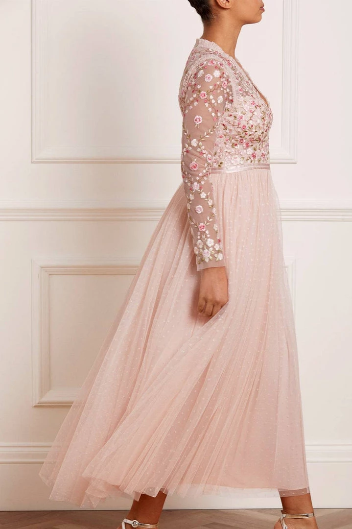 NEEDLE & THREAD EXCLUSIVE. The Rosie Lace Bodice Long Sleeve V-Neck Ankle Gown in Petal Pink. Beautifully decorated with embroidery throughout, this gown features rose floral motifs, lace borders and a satin waistband. Its skirt is crafted from soft tulle with an ‘x’ motif design. The perfect gown for every special occasion.