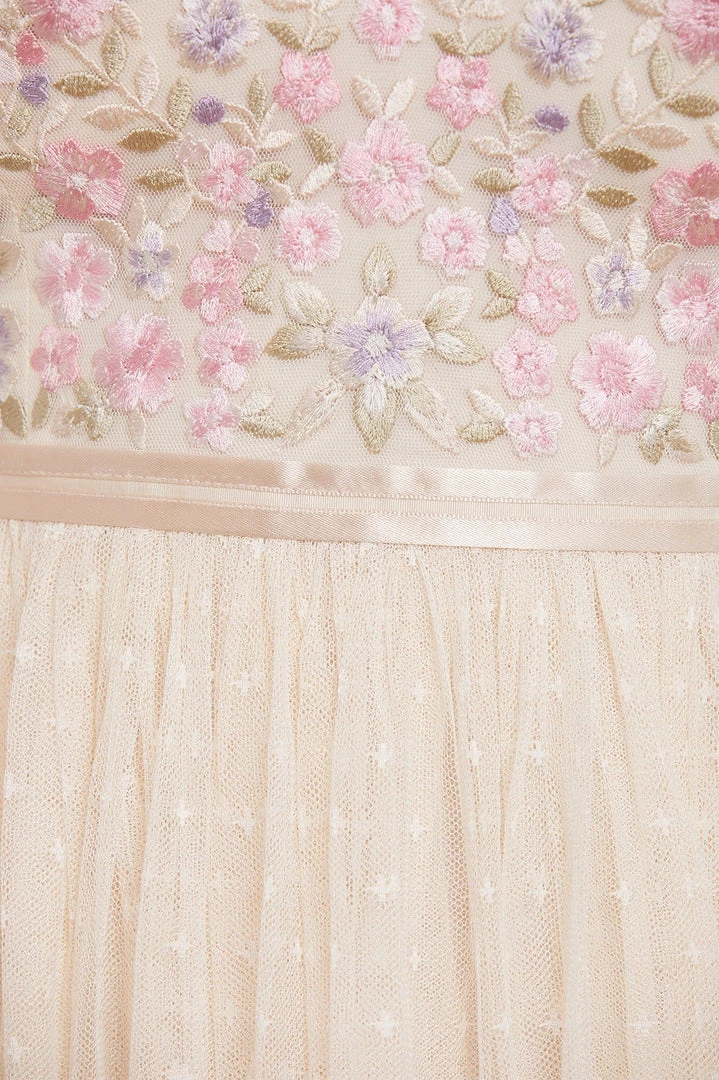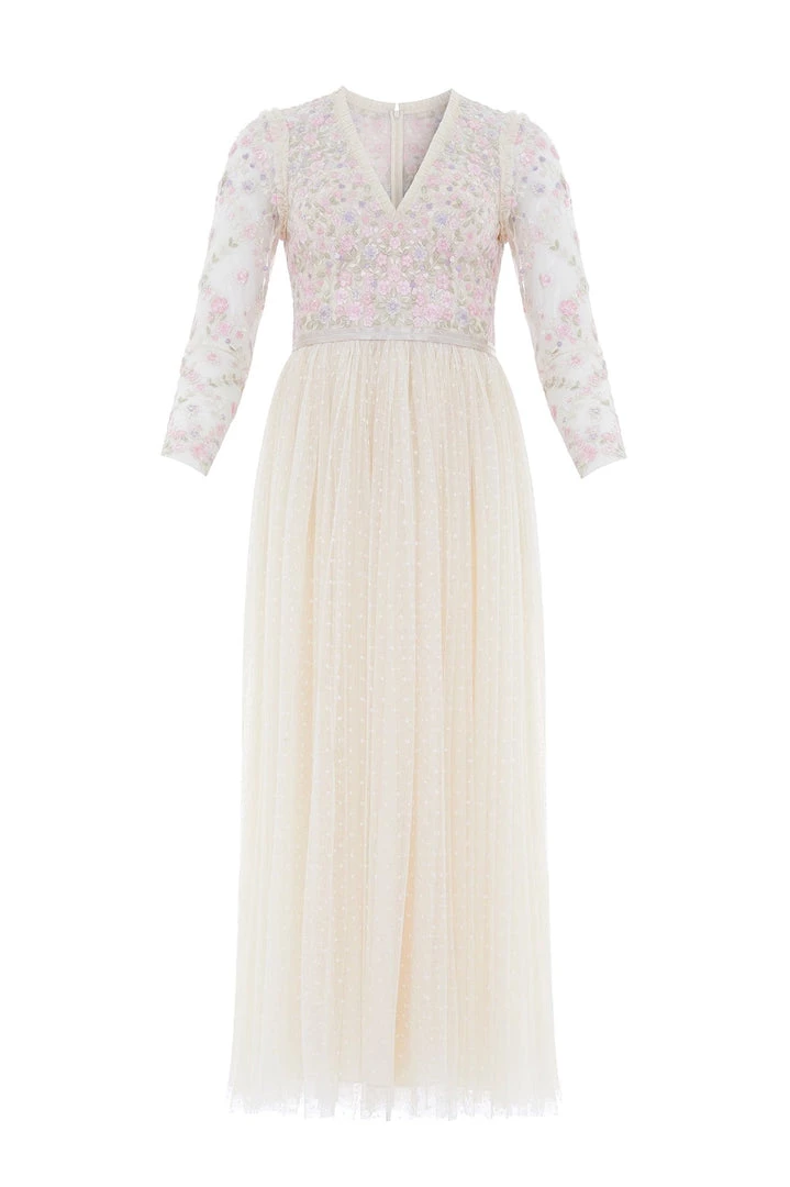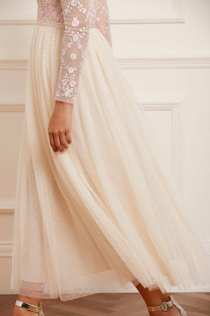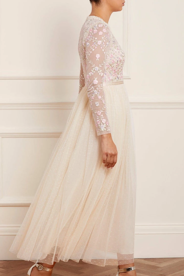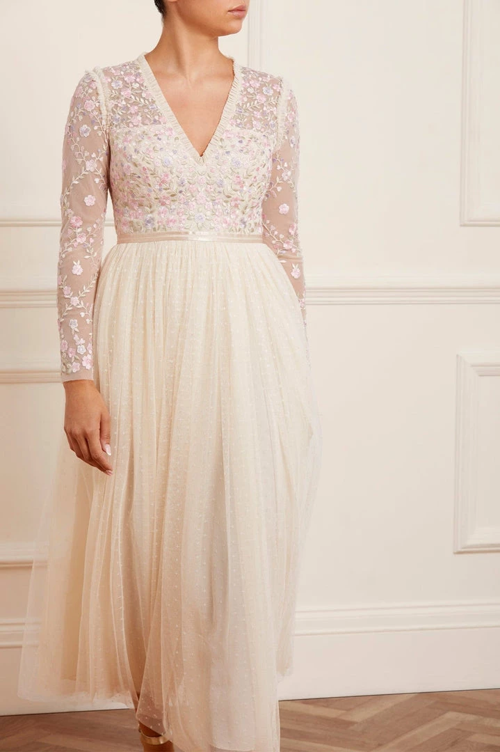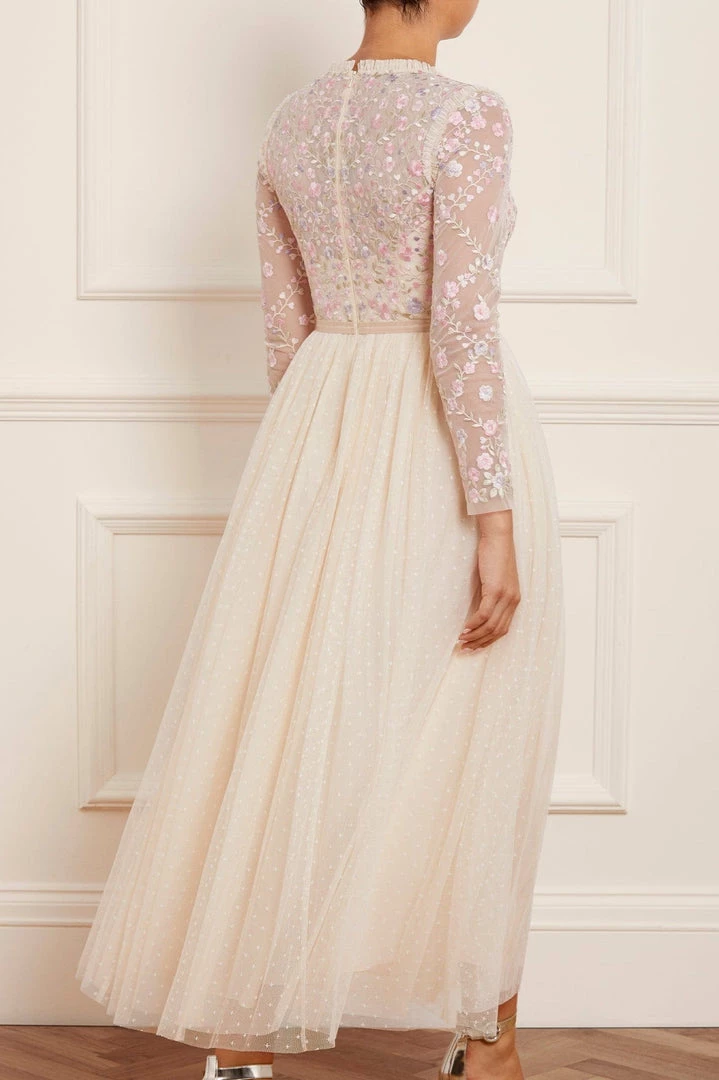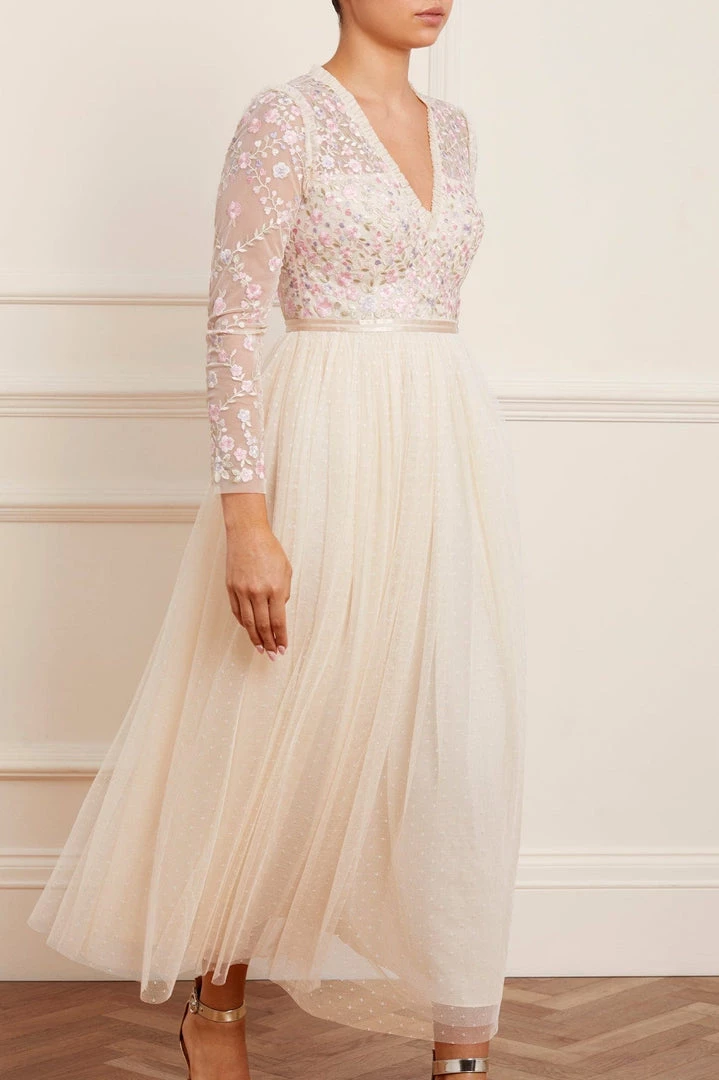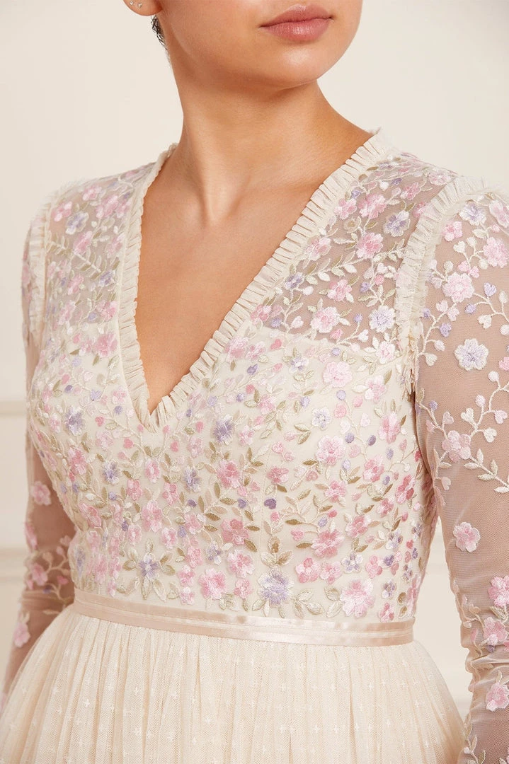 NEEDLE & THREAD EXCLUSIVE. The Rosie Lace Bodice Long Sleeve V-Neck Ankle Gown in Champagne / Pink Multi. Beautifully decorated with embroidery throughout, this gown features rose floral motifs, lace borders and a satin waistband. Its skirt is crafted from soft tulle with an ‘x’ motif design. The perfect gown for every special occasion.