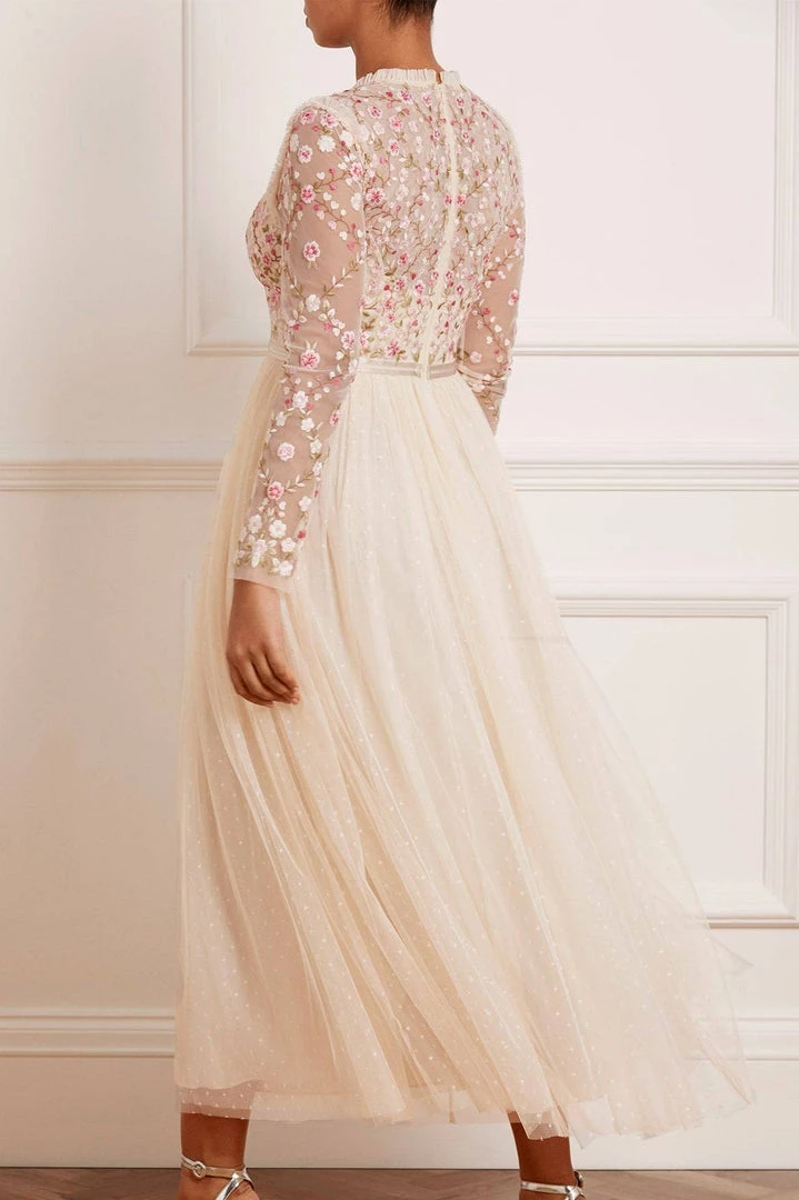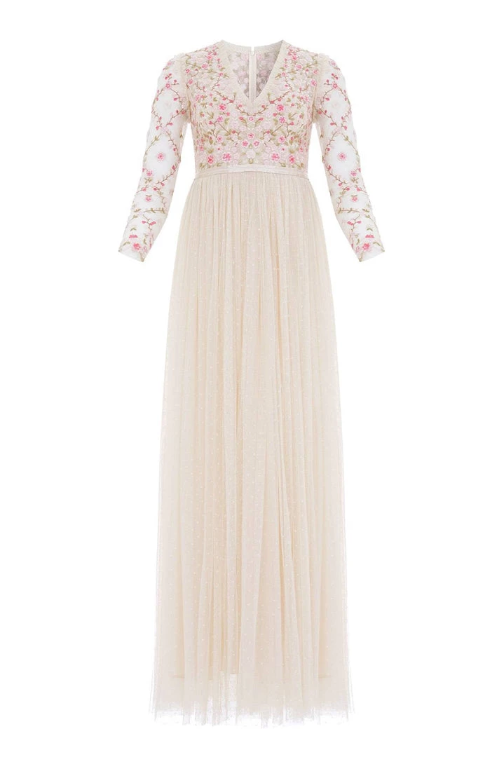 The Rosie Lace Bodice Long Sleeve V-Neck Ankle Gown in Champagne. Beautifully decorated with embroidery throughout, this gown features rose floral motifs, lace borders and a satin waistband. Its skirt is crafted from soft tulle with an ‘x’ motif design. The perfect gown for every special occasion.