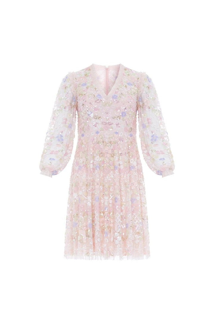 The Shimmer Fairytale V-Neck Mini Dress in Petal Pink / Sundaze. Intricately adorned with a multi-coloured floral and bird artwork with shimmering sequins to create a romantic look. Beautifully designed with long sleeves, a V-neckline and Needle & Thread signature detailing. This mini dress is developed with a tulle net skirt to create a flattering silhouette. The ultimate fairytale piece.