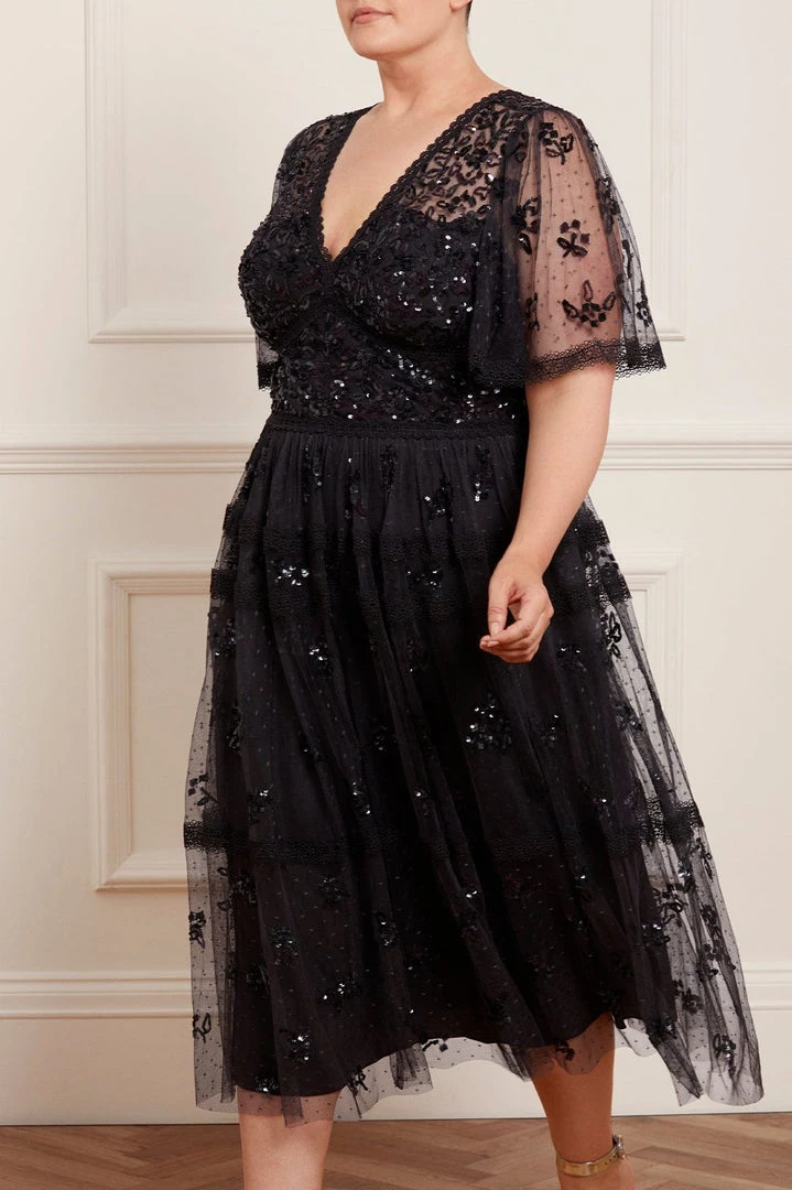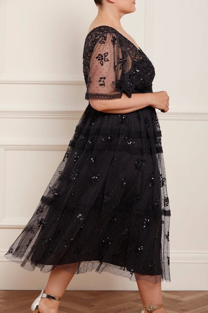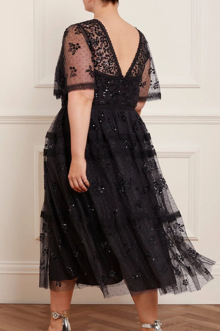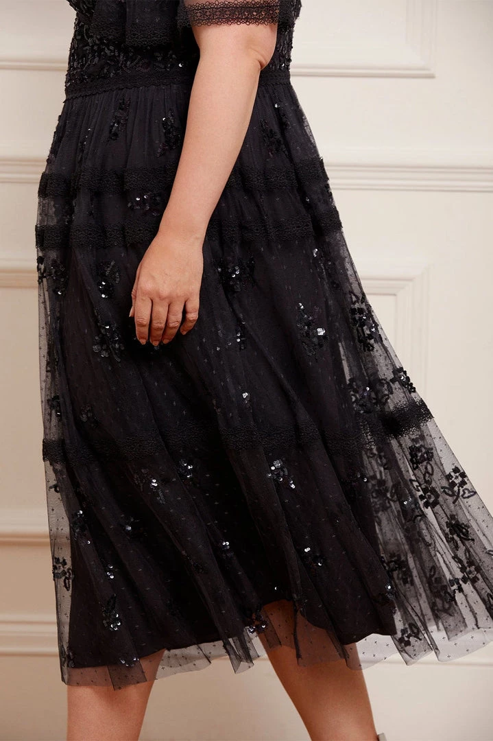 The Shimmer Primrose Midaxi Dress in Graphite. This midaxi dress is adorned with small floral motifs in shimmering sequins scattered throughout. Intricately designed with lace trim edges along the hem, romantic cut sleeves and a layered tulle skirt. The perfect dress for every occasion.