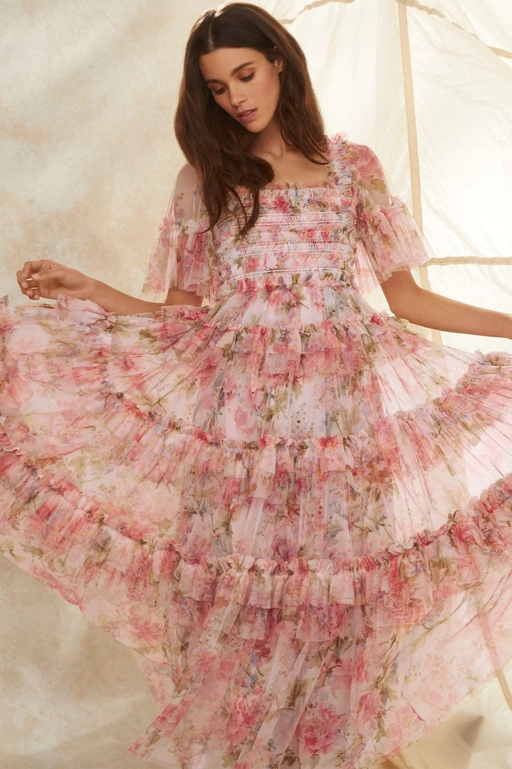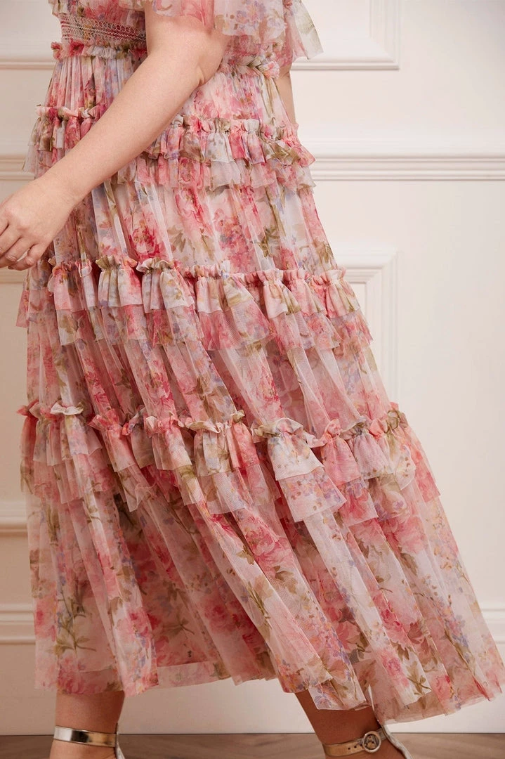 The Summer Song Peaches Smocked Ankle Gown in Moonshine / Pink. This statement gown is beautifully printed with a romantic, floral artwork in sunset colours of dusk. Designed with playful layered tiers and frills, plus a generous full skirt for romantic movement. This ankle gown features an elasticated smocked waist for comfort and pretty detailing and is beautifully crafted with short sleeves, tulle ruffles and a ‘x’ kiss motif throughout. The perfect gown to take you from day to night.