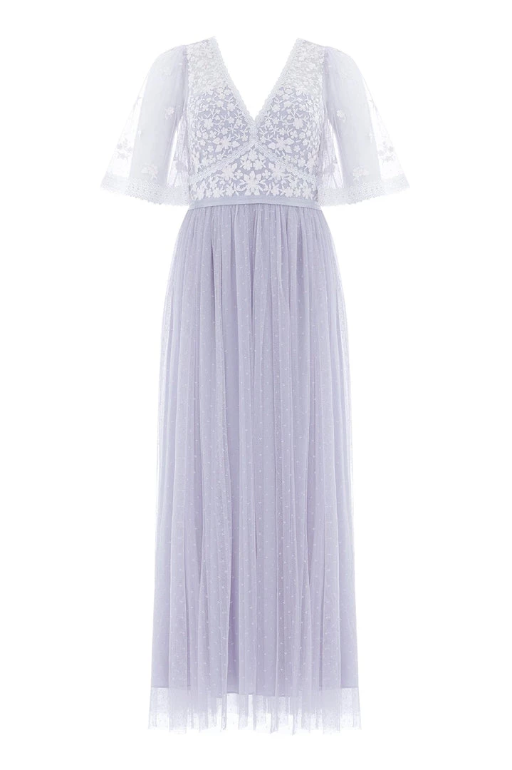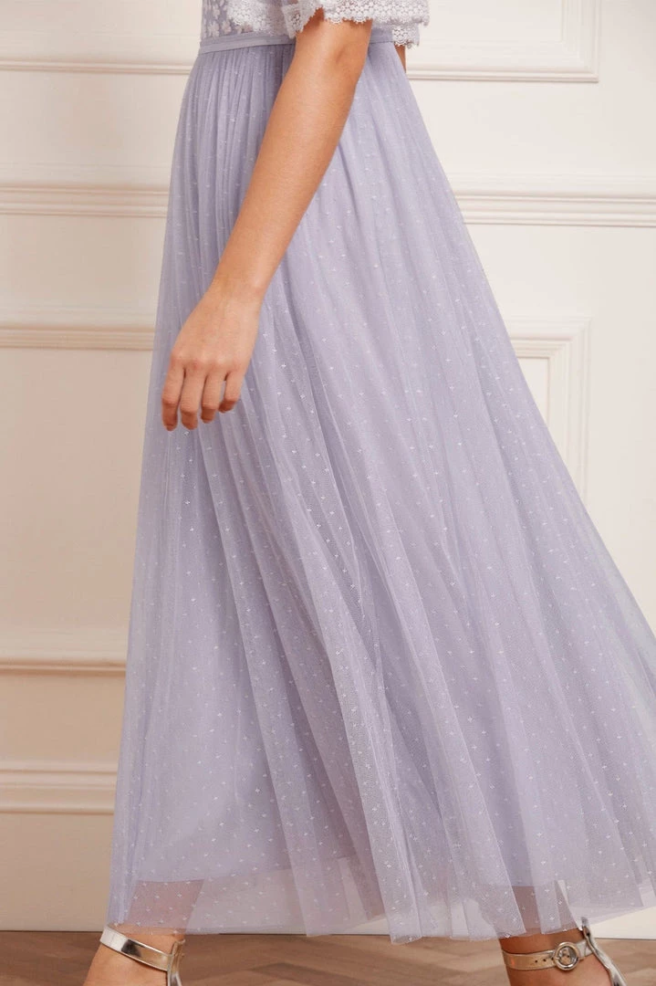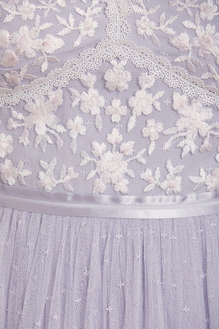 NEW SEASON. The Sweetheart Lace Bodice Ankle Gown in Porcelain Blue/White. A signature Needle & Thread style. The bodice of this gown is embroidered delicately with a floral lace artwork. Beautifully trimmed with a satin waistband and a textured kisses tulle skirt for romantic movement. The perfect gown to take you from day to night.