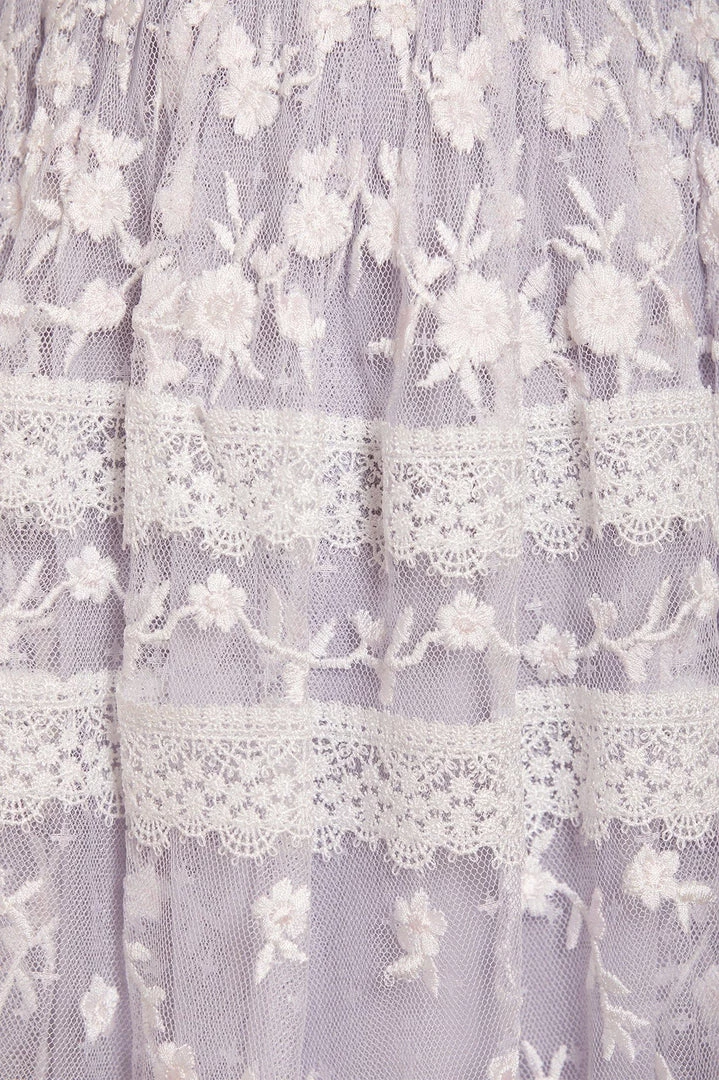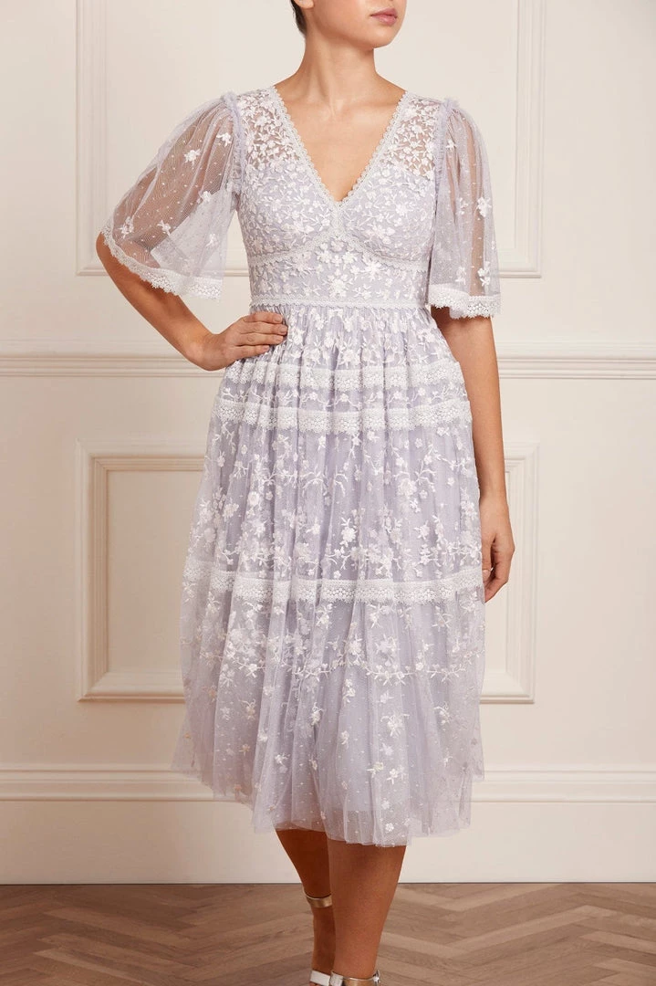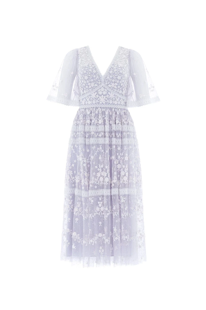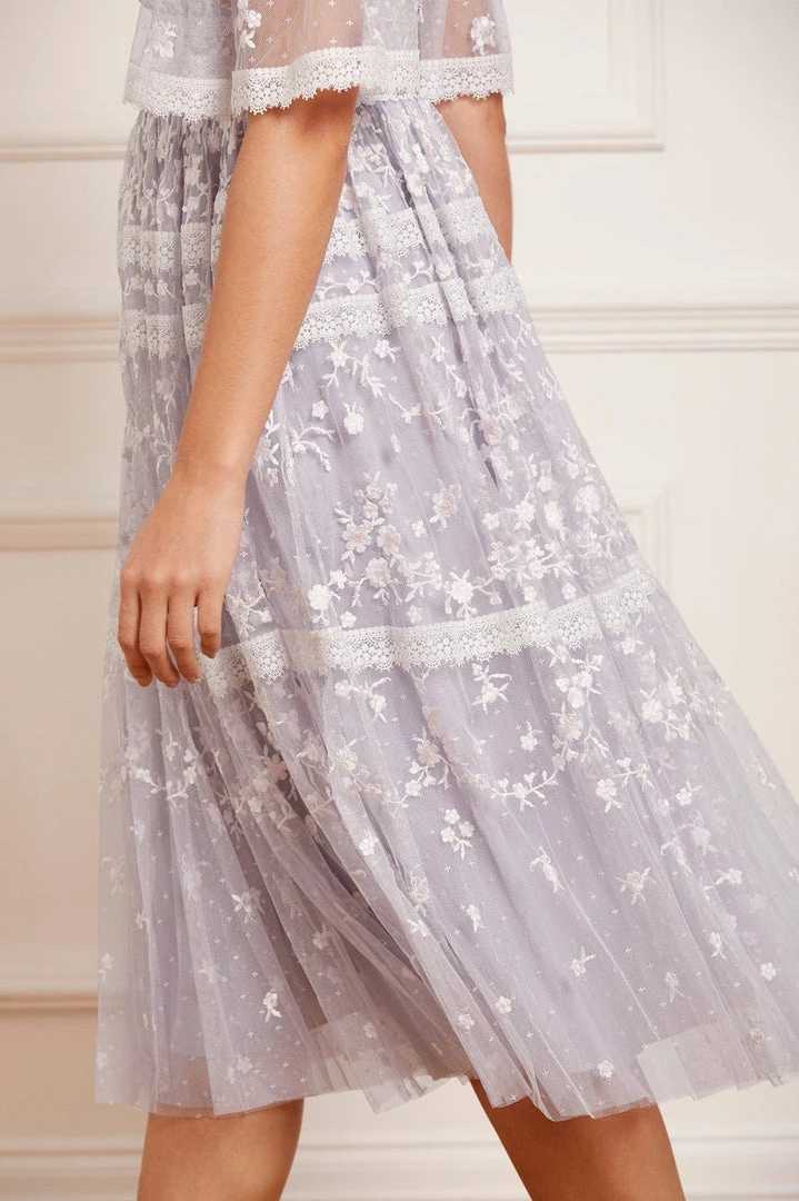 NEW SEASON. The Sweetheart Lace Midaxi Dress in Porcelain Blue/White. A signature Needle & Thread style. This midaxi dress is embroidered delicately with a floral lace artwork. Designed beautifully with intricate trimmed lace in pretty border motifs and perfectly positioned tiers through the skirt. Crafted from soft, kisses tulle creating a romantic texture throughout. The perfect dress to take you from day to night.