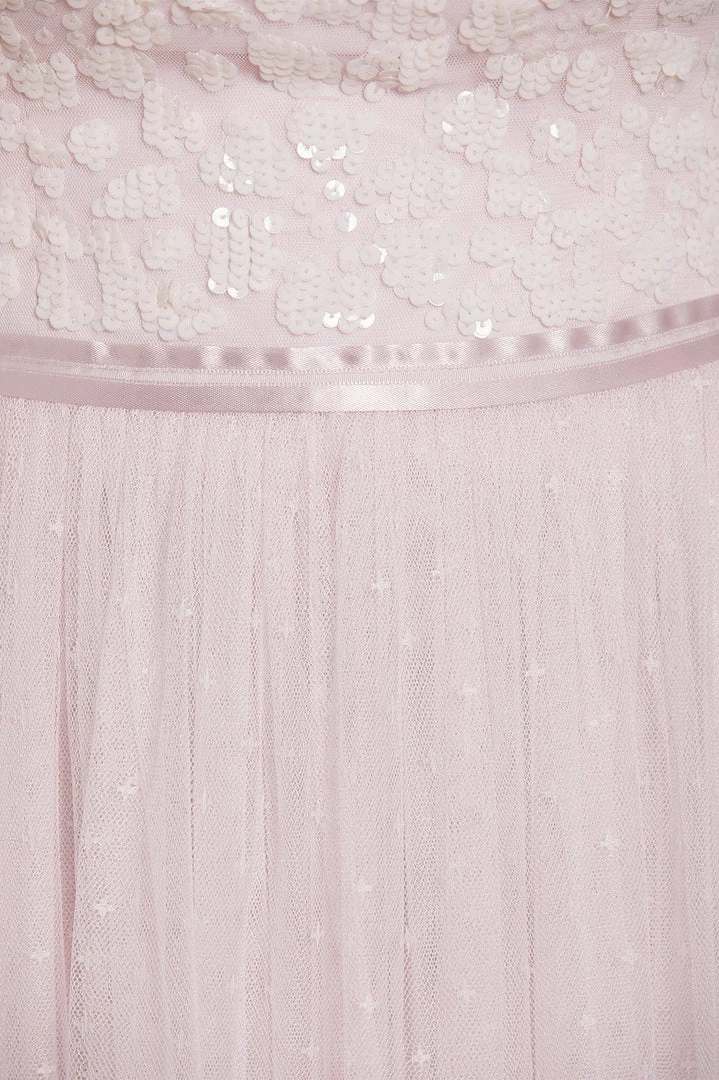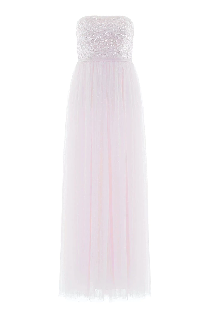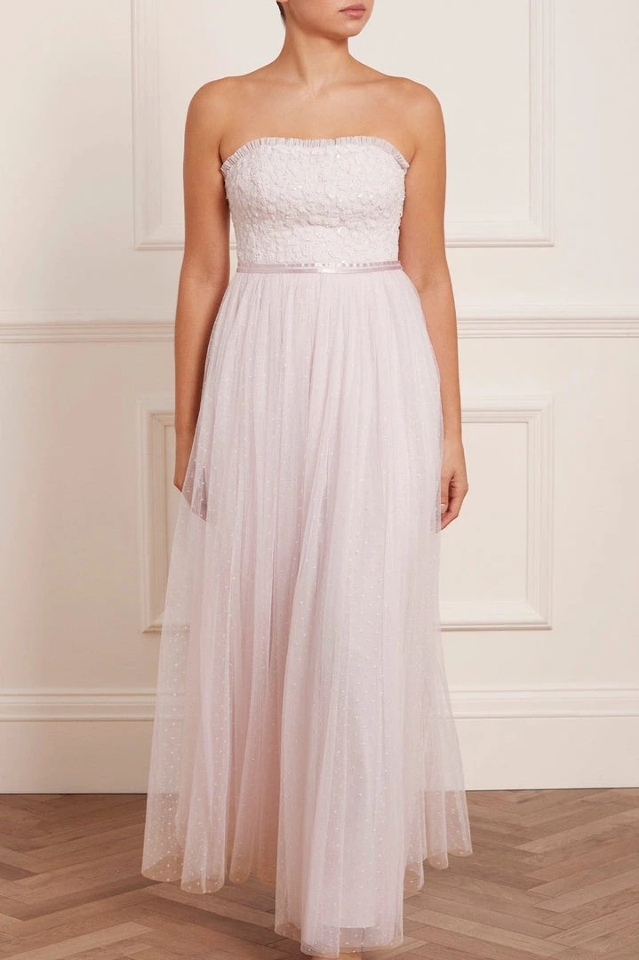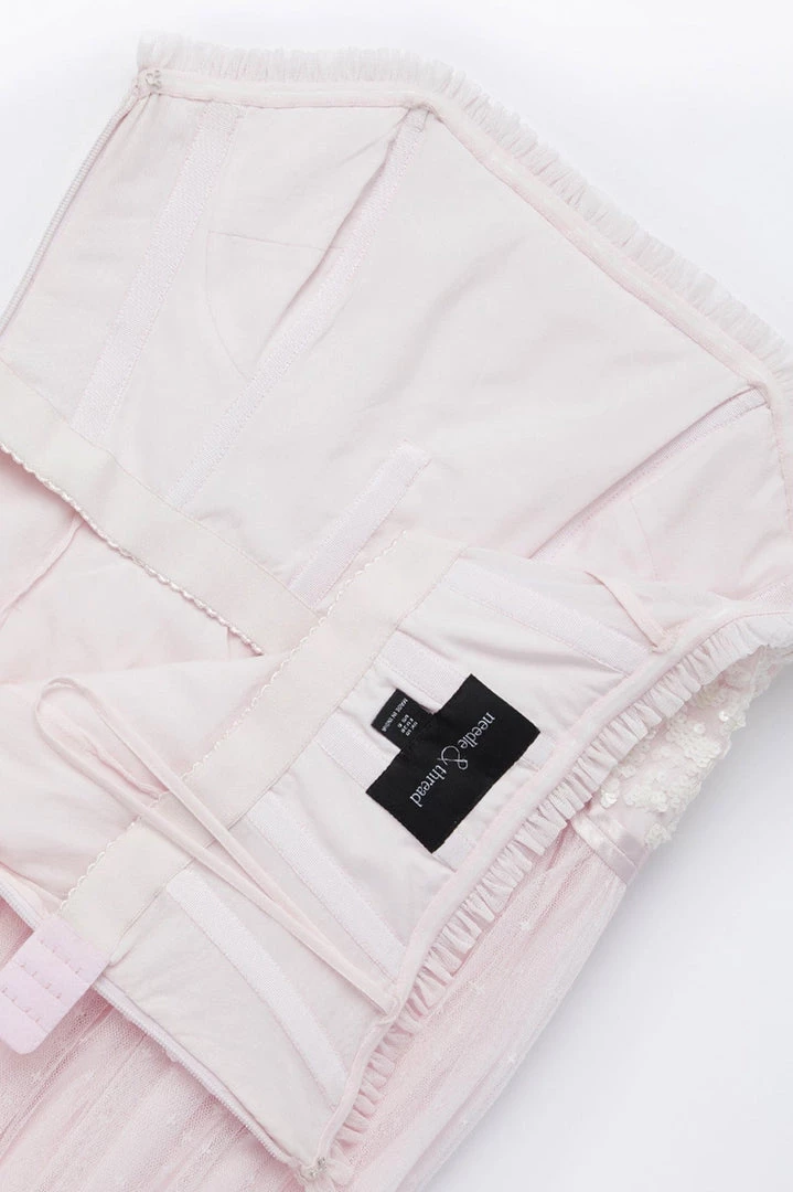 NEW SEASON. The Tempest Strapless Corset Bodice Gown in Powder Pink/White. The bodice of this gown is embellished with shimmering, iridescent sequins in romantic floral lace motifs. Designed with an integrated corset made with ribbon stitching, soft boning and panels of stretch mesh fabric for comfort and security in the fit. Crafted with layers of signature kisses tulle creating romantic movement as you walk. A true fairytale piece in the collection.