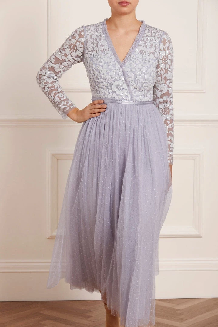 NEW SEASON. The Tempest V-Neck Bodice Ankle Gown in Porcelain Blue/White. This beautiful gown is inspired by a pretty vintage lace tablecloth design. The bodice is adorned with sequins, creating an all-over shimmer effect. Crafted with long sleeves, a v-neckline and a tulle multi-layered skirt. Make an entrance in the Tempest at your next event.