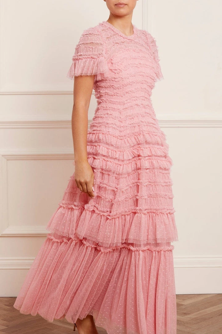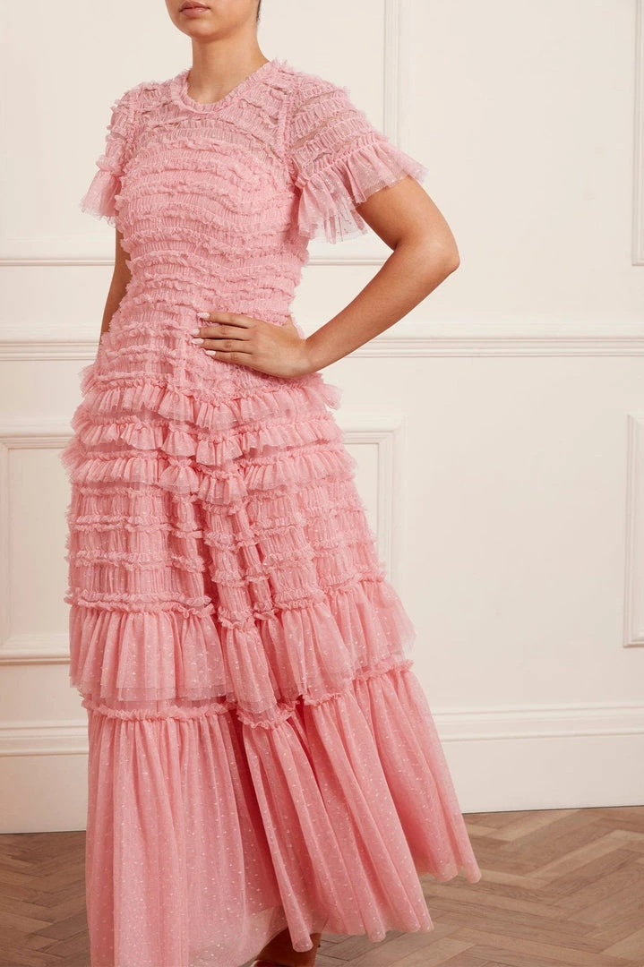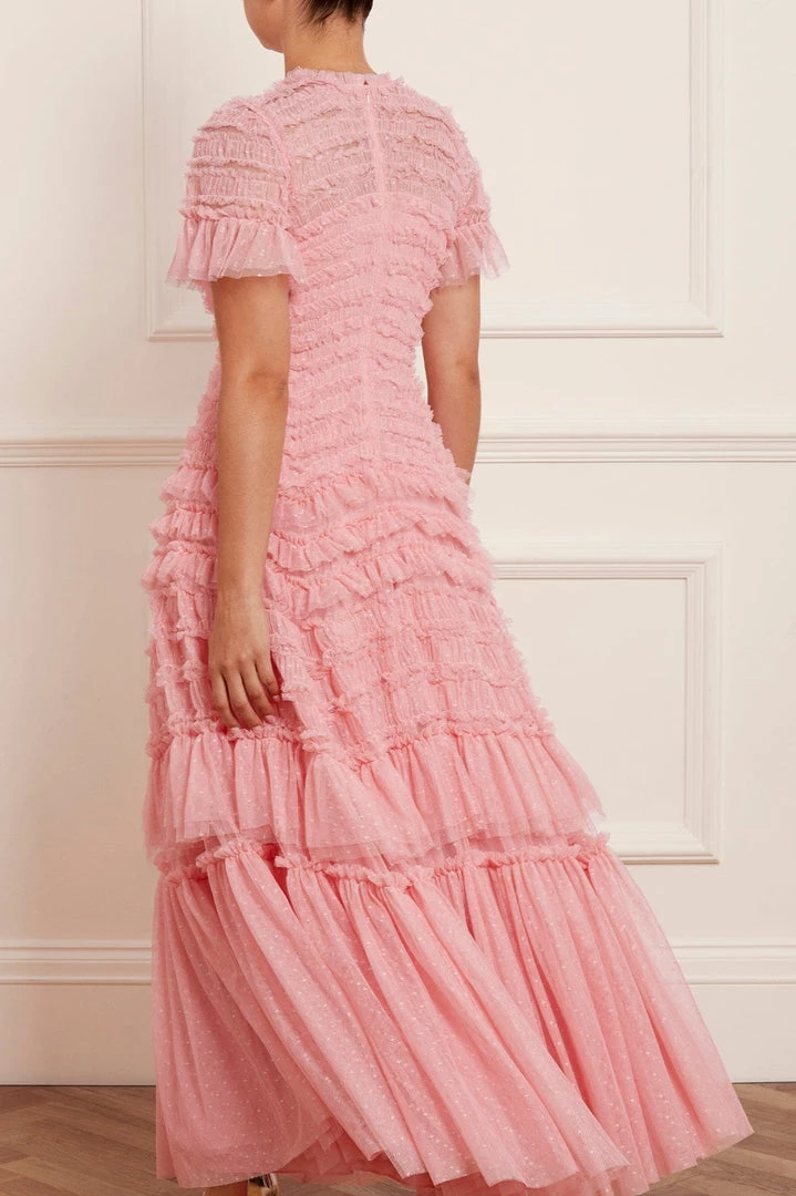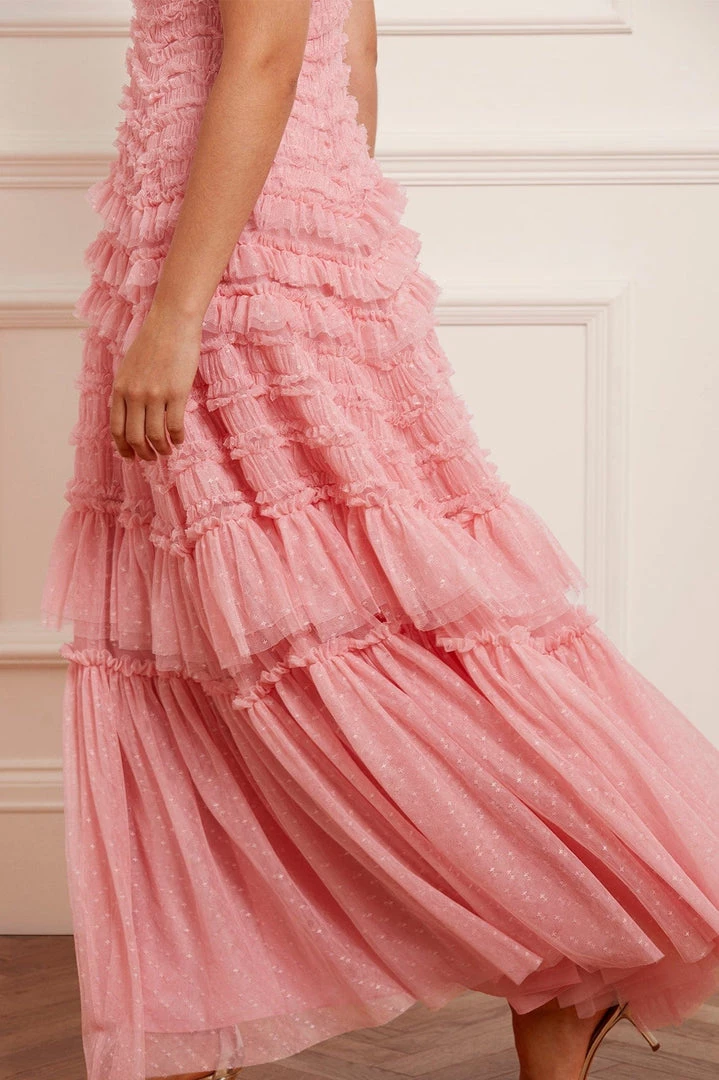 NEW SEASON. The Valentine Ruffle Gown in Rose Pink. A signature Needle & Thread style developed with textile ruffles and flattering tulle, creating a romantic look. The ruffles cascade down the dress, starting smaller and gradually getting bigger towards the hem to create soft, fluid movement. Crafted from our signature Needle & Thread kisses tulle. Make a statement in the Valentine.