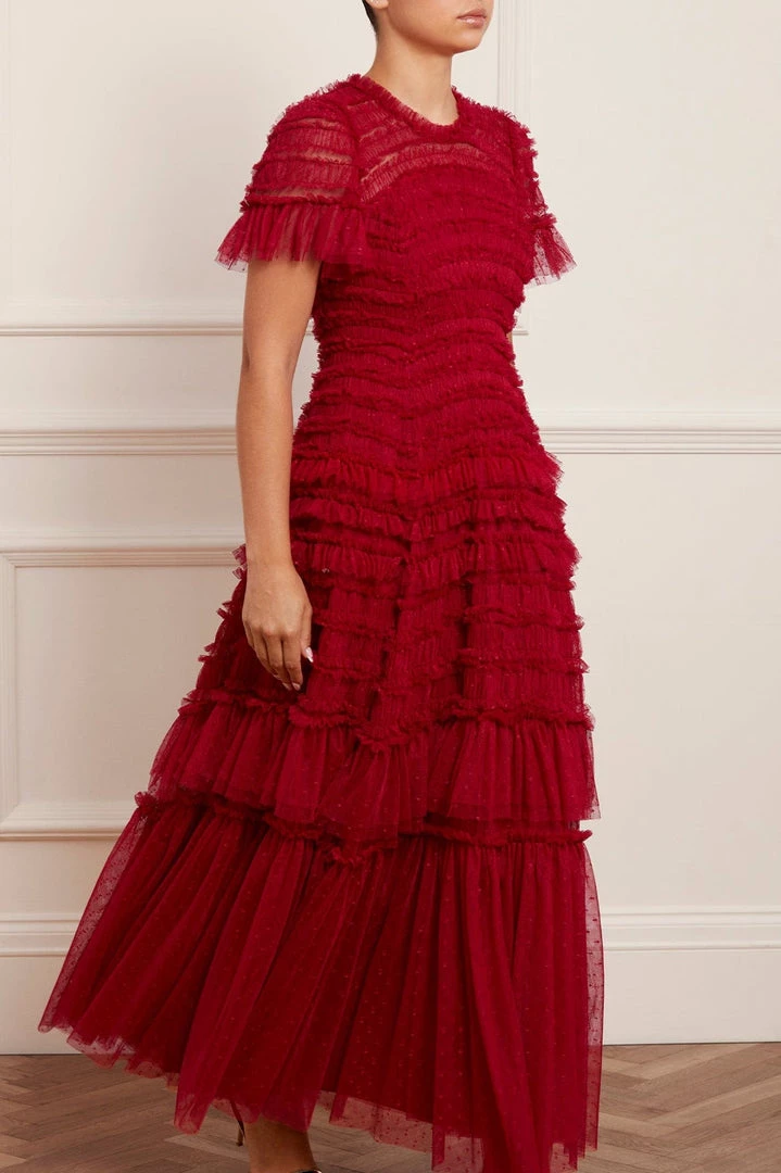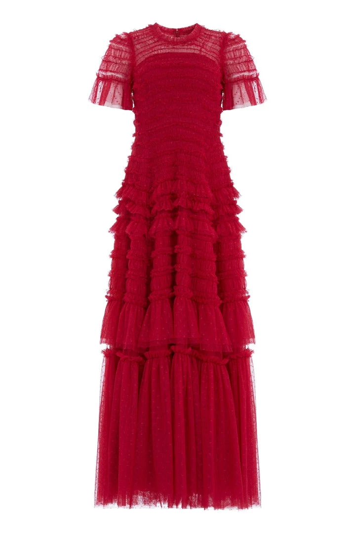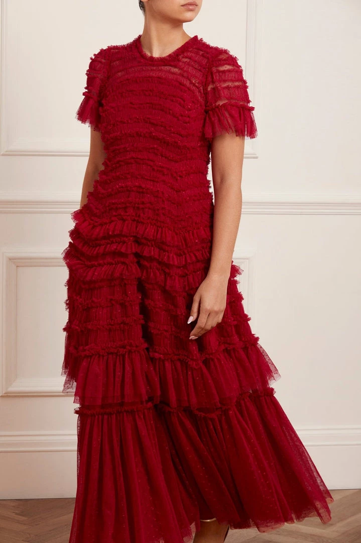 NEW SEASON. The Valentine Ruffle Gown in Deep Red. A signature Needle & Thread style developed with textile ruffles and flattering tulle, creating a romantic look. The ruffles cascade down the dress, starting smaller and gradually getting bigger towards the hem to create soft, fluid movement. Crafted from our signature Needle & Thread kisses tulle. Make a statement in the Valentine.