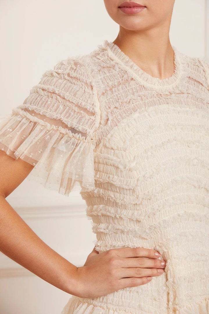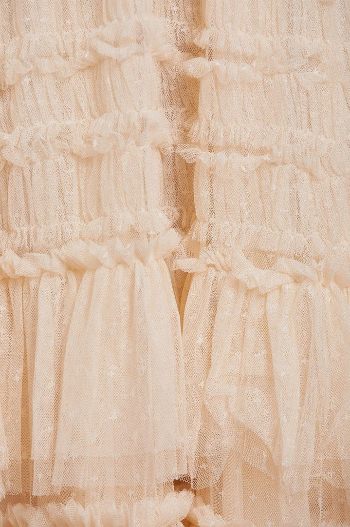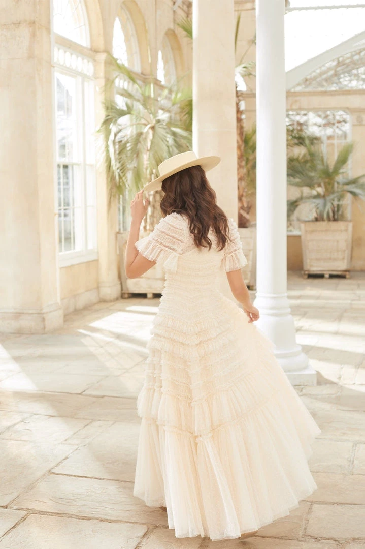 NEW SEASON. The Valentine Ruffle Gown in Champagne. A signature Needle & Thread style developed with textile ruffles and flattering tulle, creating a romantic look. The ruffles cascade down the dress, starting smaller and gradually getting bigger towards the hem to create soft, fluid movement. Crafted from our signature Needle & Thread kisses tulle. Make a statement in the Valentine.