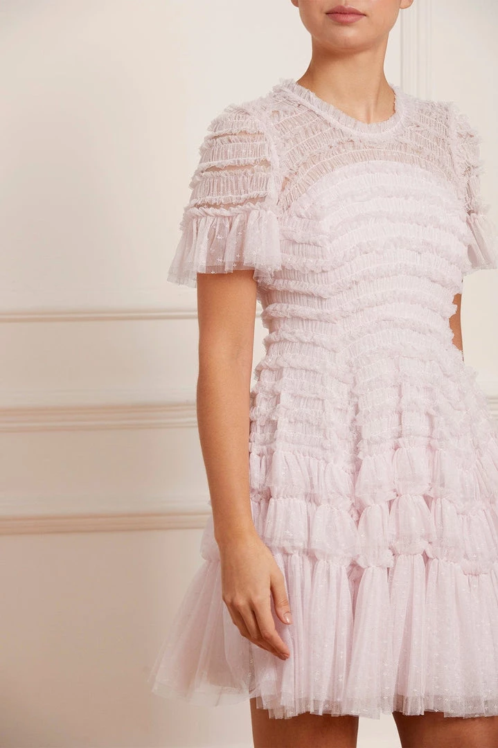 NEW SEASON. The Valentine Ruffle Micro Mini Dress in Powder Pink. A signature Needle & Thread style developed with textile ruffles and flattering tulle, creating a romantic look. The ruffles cascade down the dress, starting smaller and gradually getting bigger towards the hem to create soft, playful movement. Crafted from our signature Needle & Thread kisses tulle. Make a statement in the Valentine.