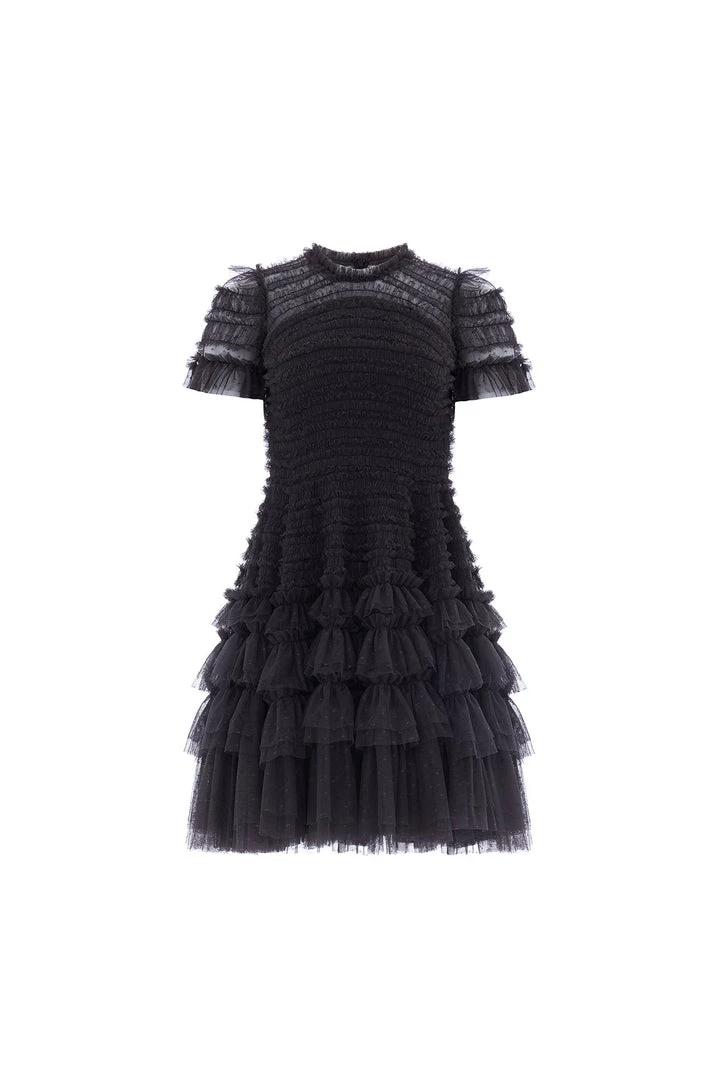 NEW SEASON. The Valentine Ruffle Micro Mini Dress in Black. A signature Needle & Thread style developed with textile ruffles and flattering tulle, creating a romantic look. The ruffles cascade down the dress, starting smaller and gradually getting bigger towards the hem to create soft, playful movement. Crafted from our signature Needle & Thread kisses tulle. Make a statement in the Valentine.