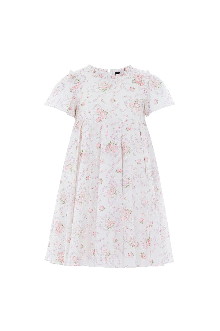 NEW SEASON. The Vintage Ditsy Cotton KIDS Prom Dress in Moonshine. The artwork of this dress is inspired by a vintage floral fabric. Beautifully printed with roses and intertwining florals to create a pretty design. Developed from organic cotton with a classic prom silhouette and generous pleats, creating romantic volume. Make this dress a wardrobe staple for your little one.
