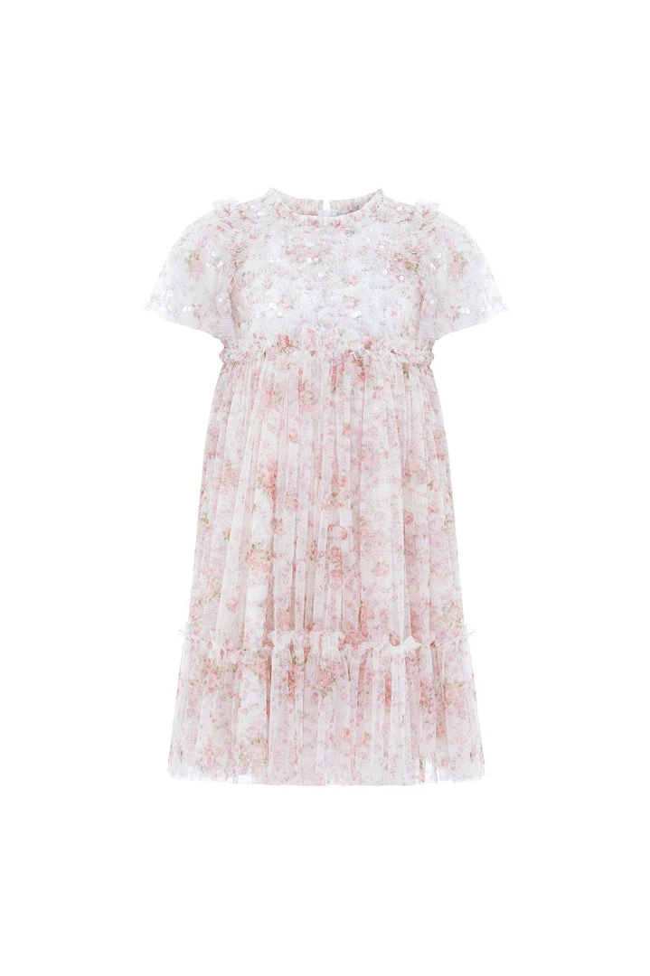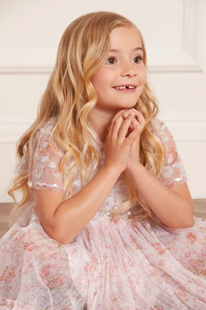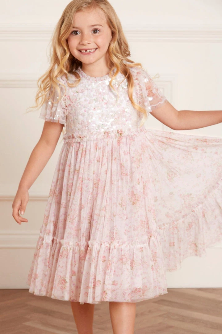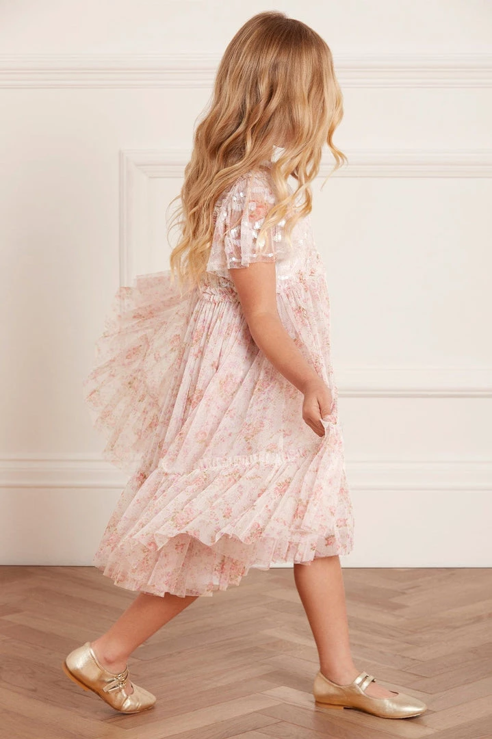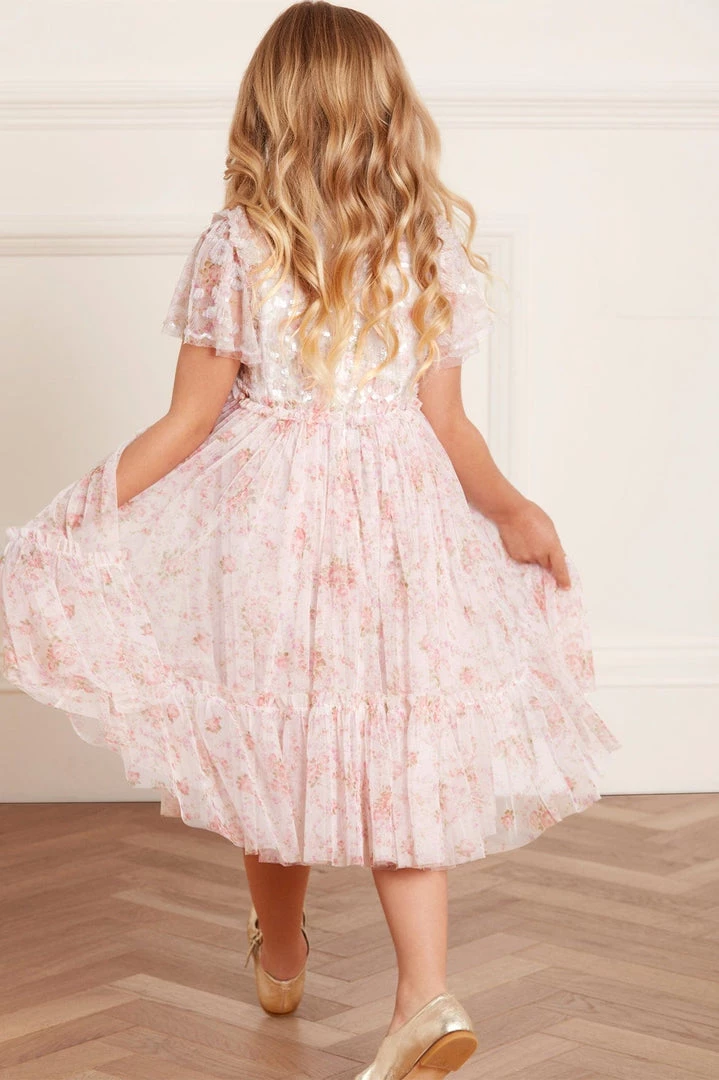 NEW SEASON. The Vintage Ditsy Sequin Bodice KIDS Dress in Moonshine. The artwork of this dress is inspired by a vintage floral fabric. Beautifully printed with roses and intertwining florals to create a pretty design. The bodice of this dress features shimmering sequins and the skirt is designed with layers of tulle for a voluminous shape. Let your little one sparkle under the spotlight in this eye-catching piece.