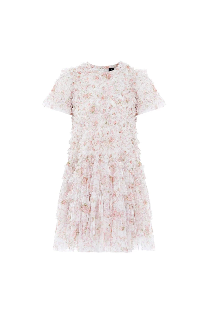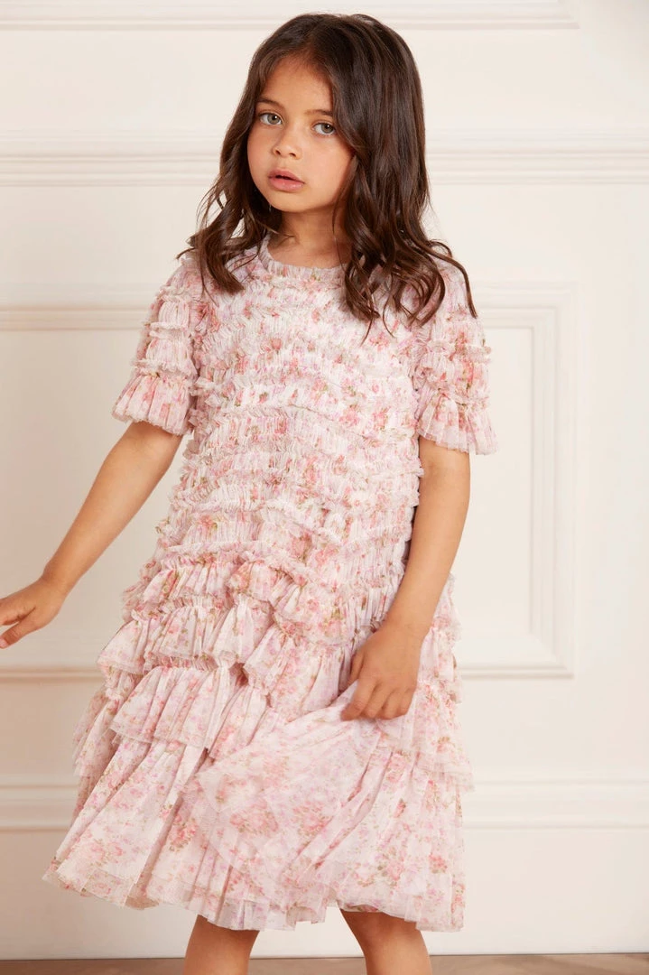 NEW SEASON. The Vintage Ditsy Valentine Ruffle KIDS Dress in Moonshine. The artwork of this dress is inspired by a vintage floral fabric. Beautifully printed with roses and intertwining florals to create a pretty design, and tulle ruffles for added texture. The ruffles cascade down the dress, starting smaller at the neckline and gradually getting bigger towards the hem to create soft, playful movement. Let your little one make a statement in the Vintage Valentine.