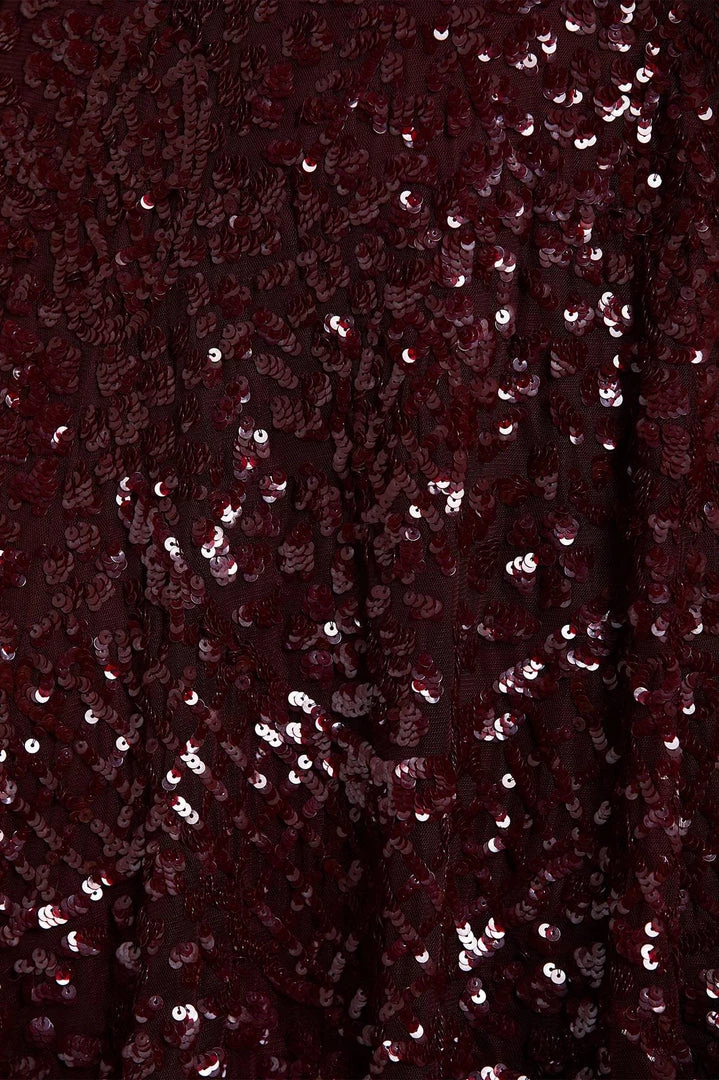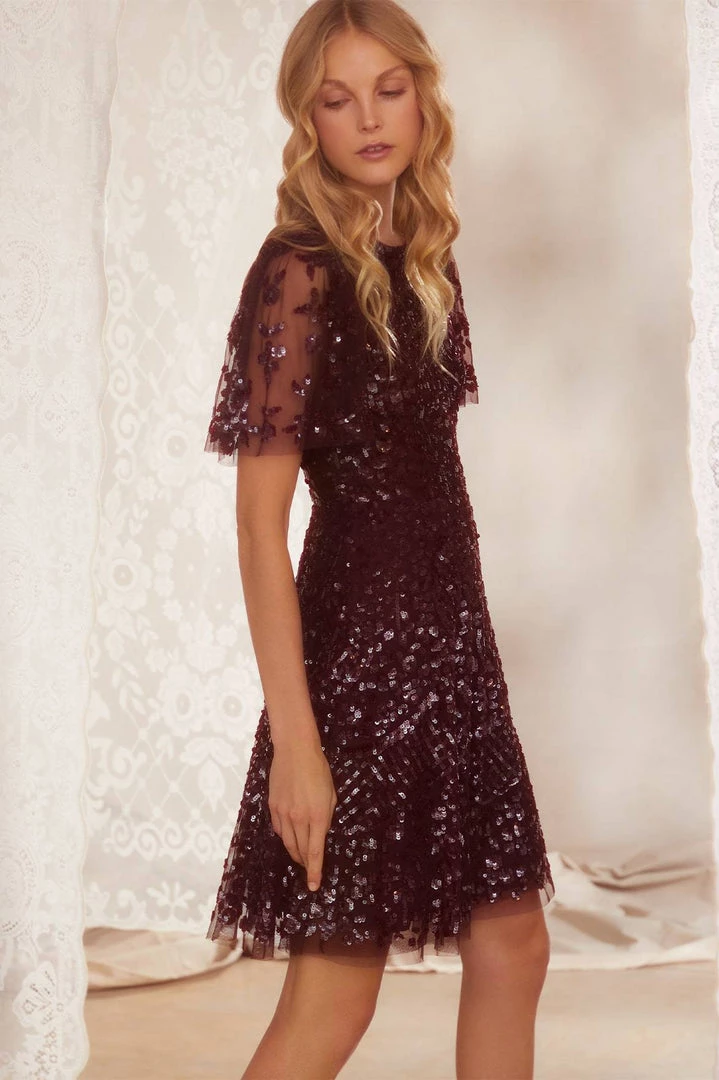 The Amalie Sequin Mini Dress in Burgundy. Decorated with intricate shimmering sequins and floral motifs, this short-sleeved dress is designed with a layered tulle skirt featuring ‘x’ motifs throughout, adding subtle texture. Make this your new season go-to.