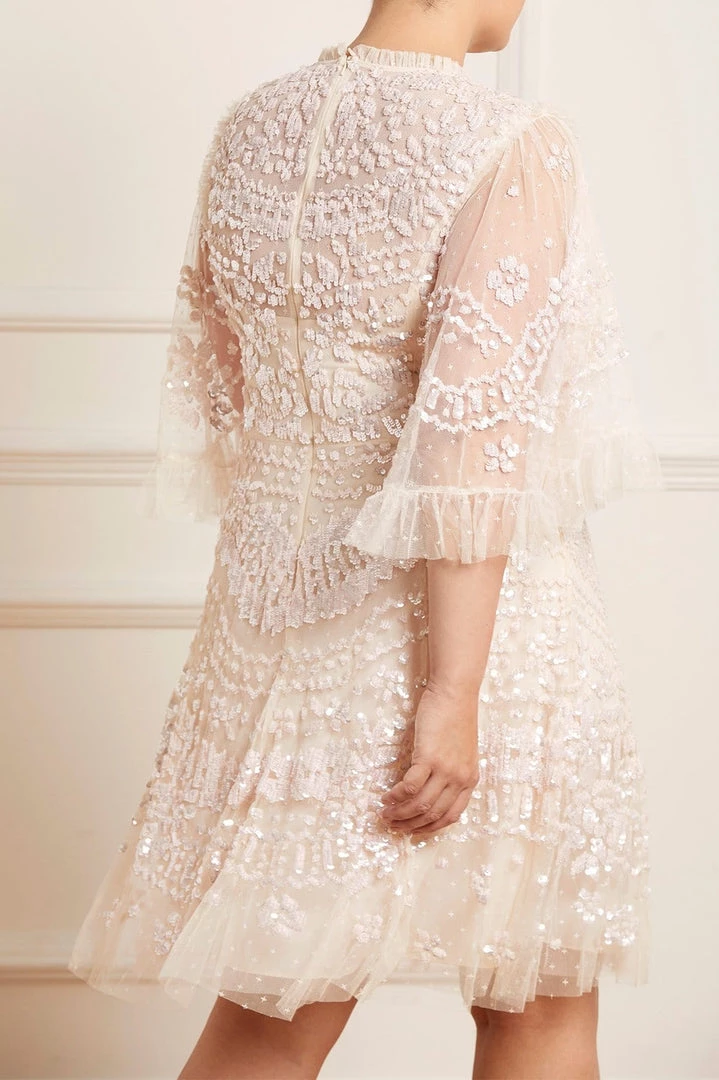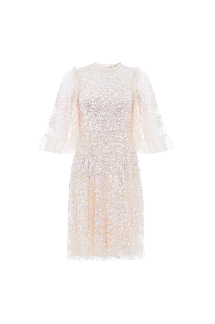 NEEDLE & THREAD EXCLUSIVE | The Anais Sequin Dress in Champagne/ Pink. This dress is beautifully decorated in champagne sequins, developed from a vintage, French hand-drawn lace design. Crafted with lace floral borders throughout and pretty, floaty sleeves. The perfect dress for any occasion.