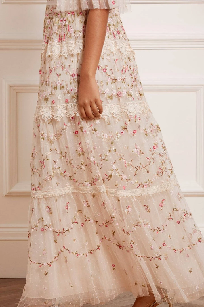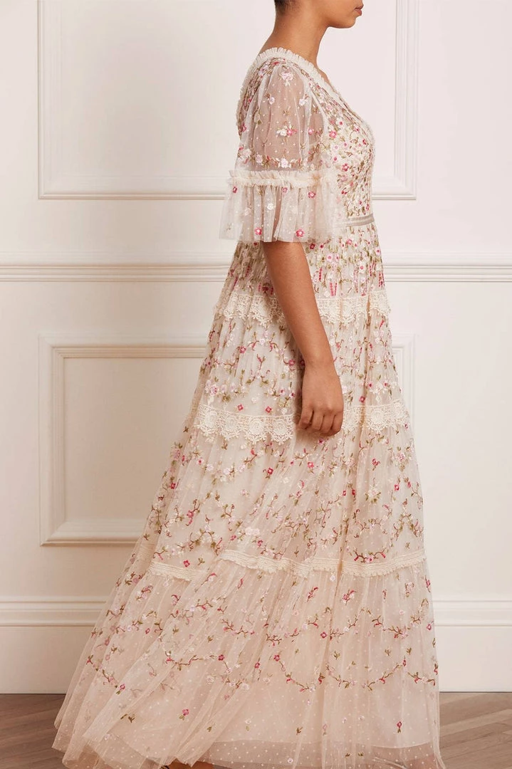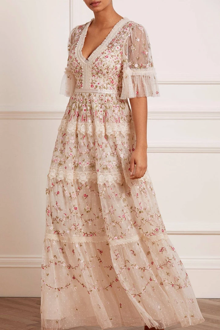 The Araminta Lace Gown in Champagne. Intricately embroidered in a multi-coloured artwork, this gown features lace trim borders. Designed with a flattering V-neckline shaping, lace trims and signature detailing adding romantic texture. The Araminta is perfect for every occasion.